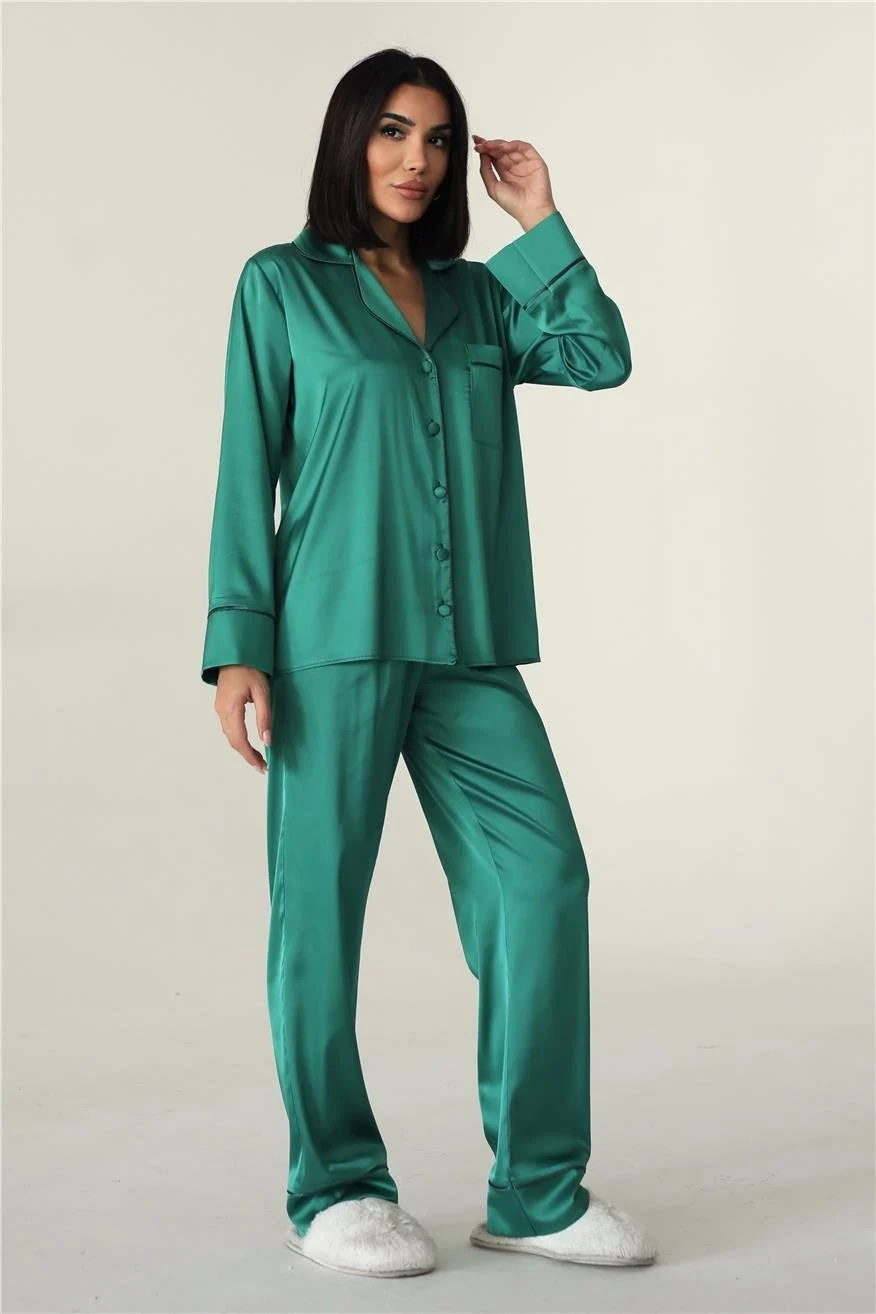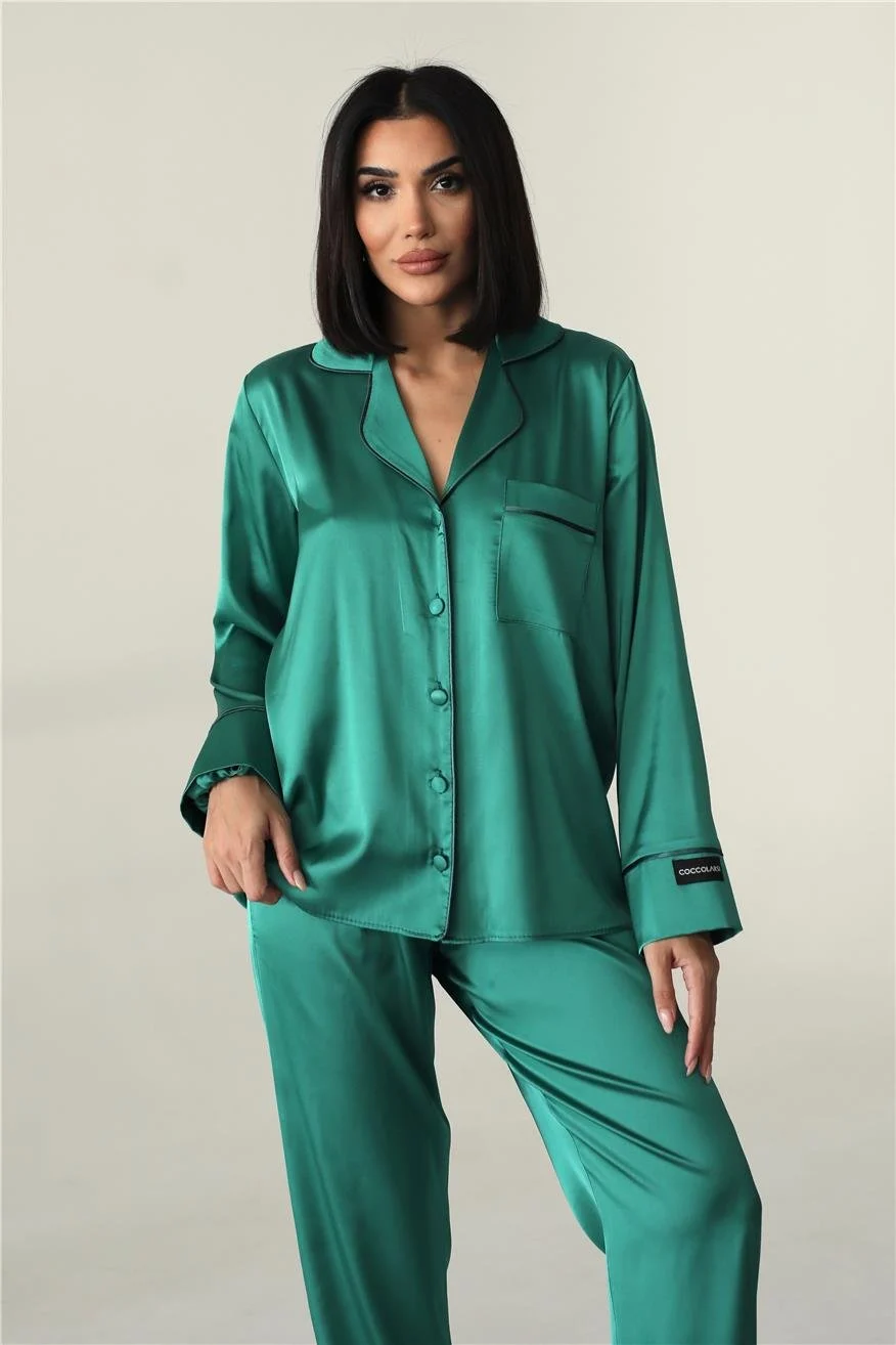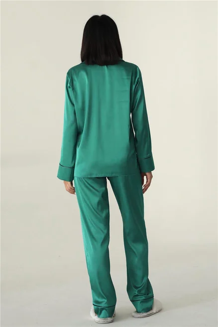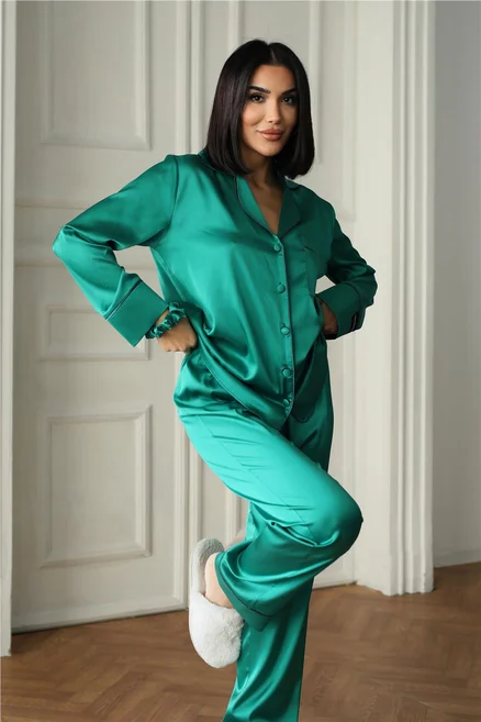 Елегантна сатенена пижама в изумрудено зелено – съчетание от лукс, мекота и стил.