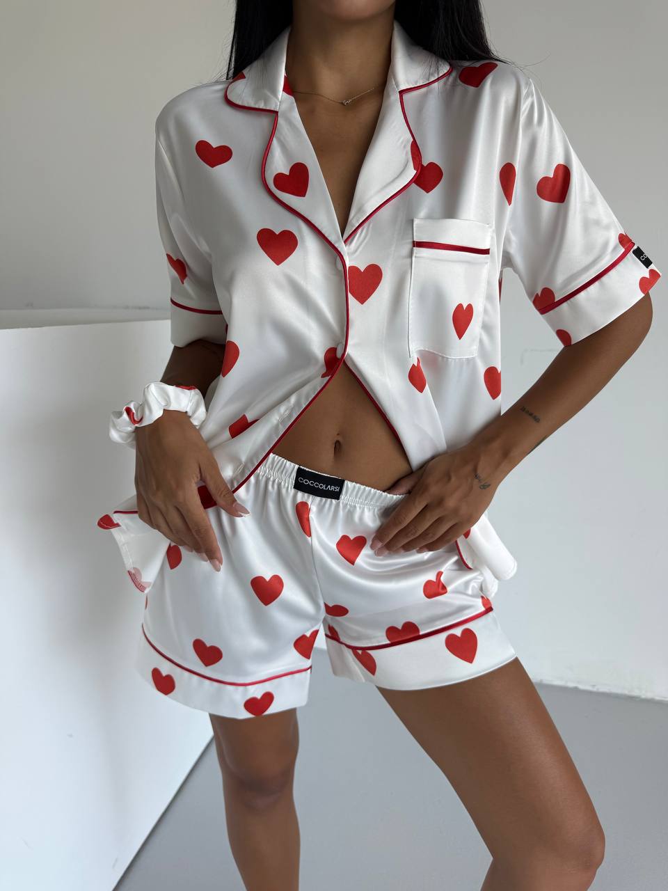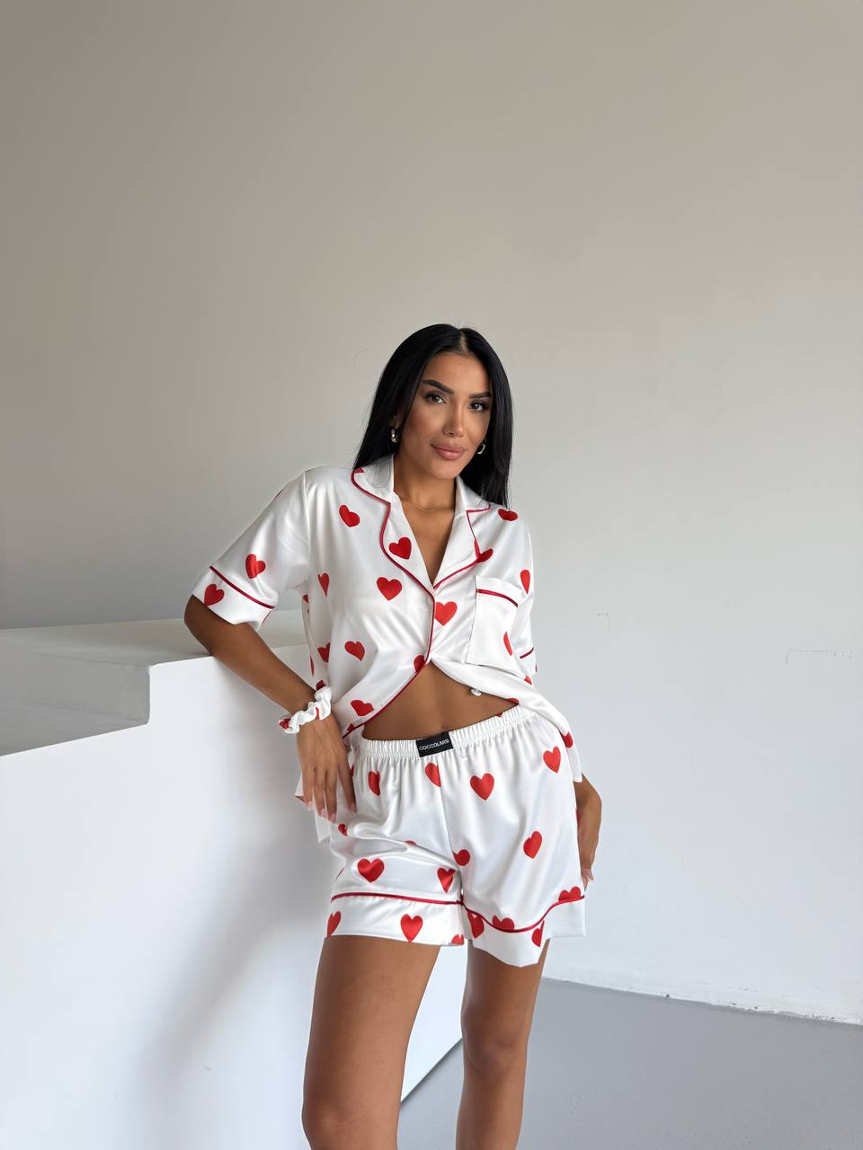 Горнището е с къс ръкав, копчета по цялата дължина и джобче отпред – идеално съчетание между удобство и елегантност. Долнището е удобни къси шорти с еластичен колан.