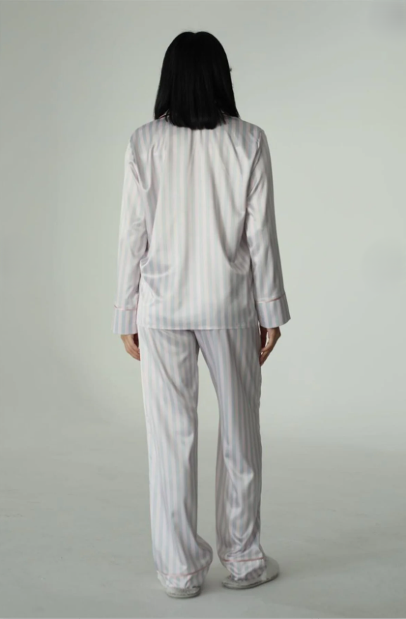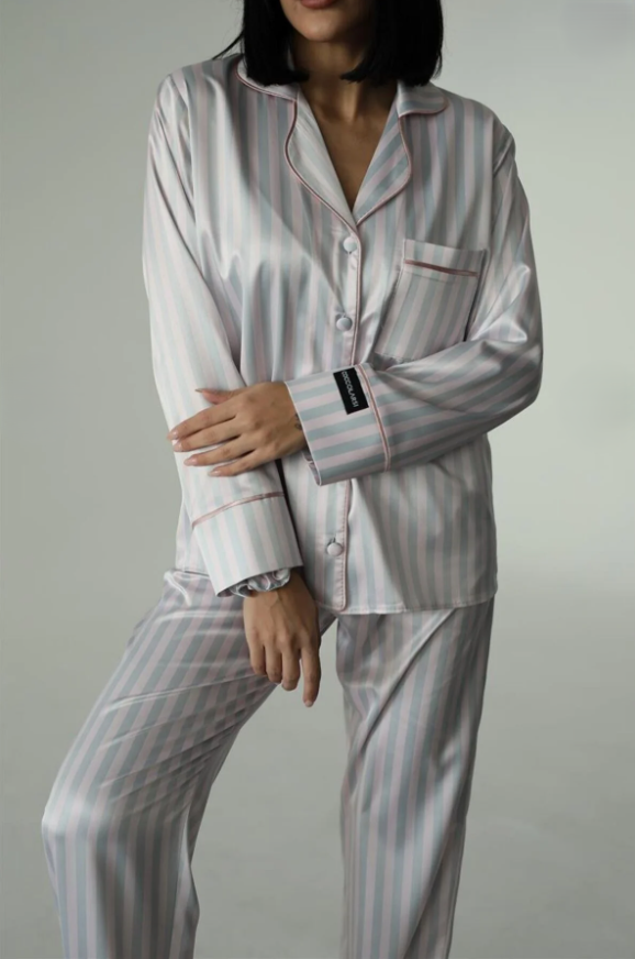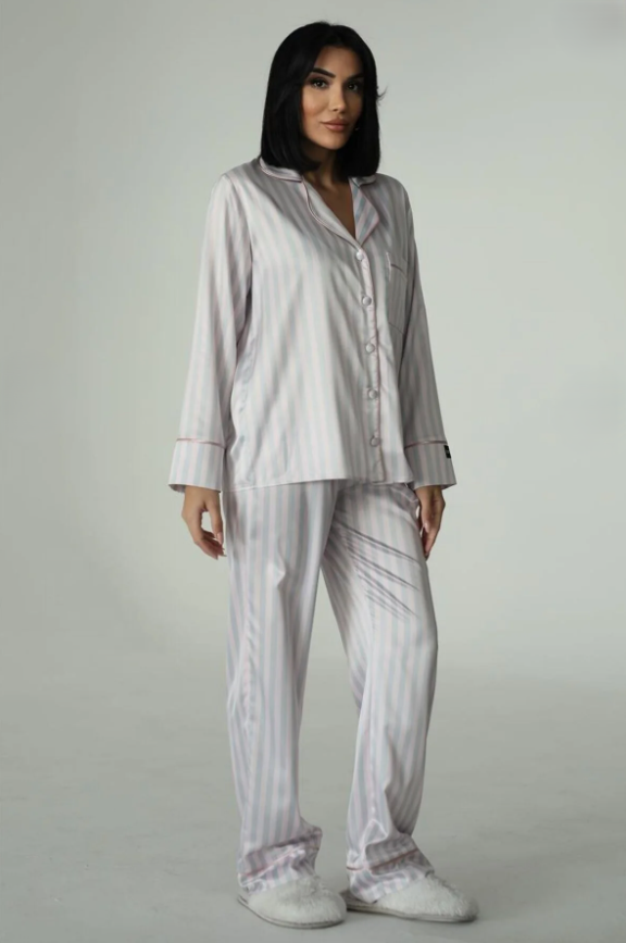 Елегантен сатенен комплект от две части. Горнище с дълъг ръкав, с копчета, яка и джоб. Долнището с дълъг прав широк крачол и ластик в талията. Към комплекта имате подарък скрънч в същият десен. Този сатенен сет е идеален избор както за домашен уют, така и за стилен подарък. Материята е мека, нежна към кожата и придава усещане за лукс.