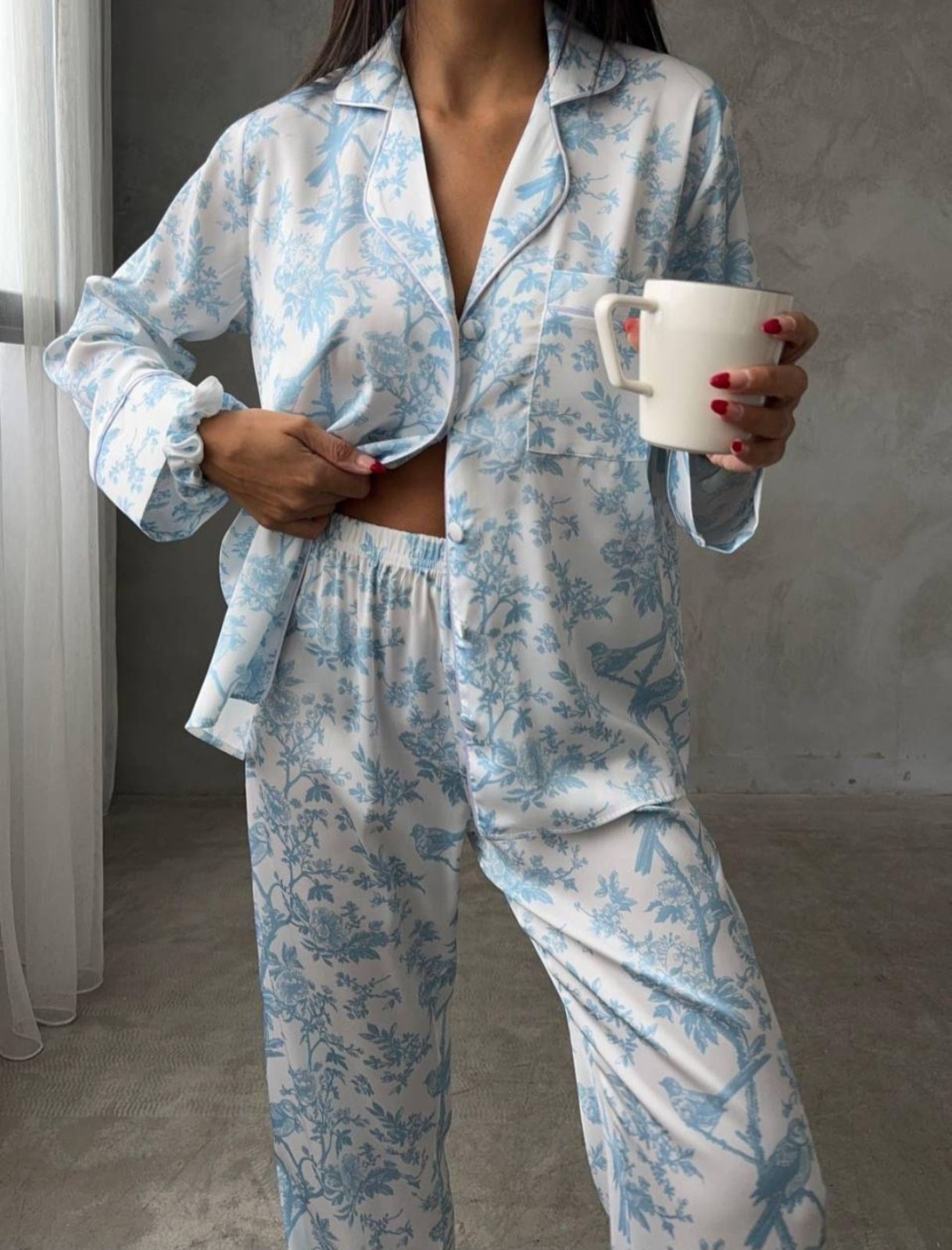 Елегантна дамска сатенена пижама с подарък- скрънчи за коса. Изработена от мек и гладък сатен. Горнището е с дълъг ръкав, копчета по цялата дължина и джобче отпред. Долнището е дълъг панталон с еластичен колан.