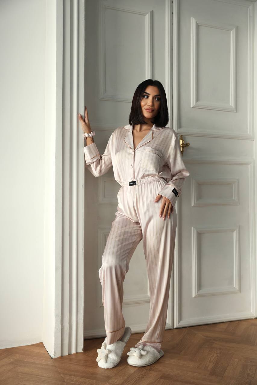 Елегантен сатенен комплект от две части. Горнище с дълъг ръкав, с копчета, яка и джоб. Долнището с дълъг прав широк крачол и ластик в талията. Към комплекта имате подарък скрънч в същият десен. Този сатенен сет е идеален избор както за домашен уют, така и за стилен подарък. Материята е мека, нежна към кожата и придава усещане за лукс.