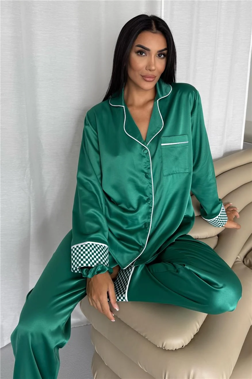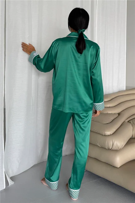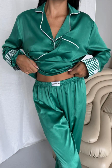 Луксозна дамска сатенена пижама с подарък-скрънчи за коса. Изработена от мек и гладък сатен. Горнището е с дълъг ръкав, копчета по цялата дължина и джобче отпред. Долнището е дълъг панталон с еластичен колан.