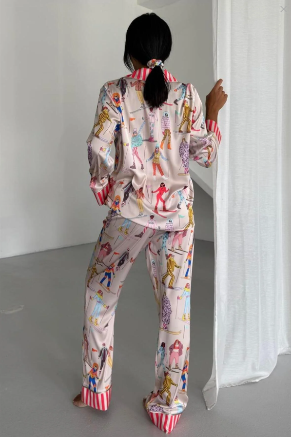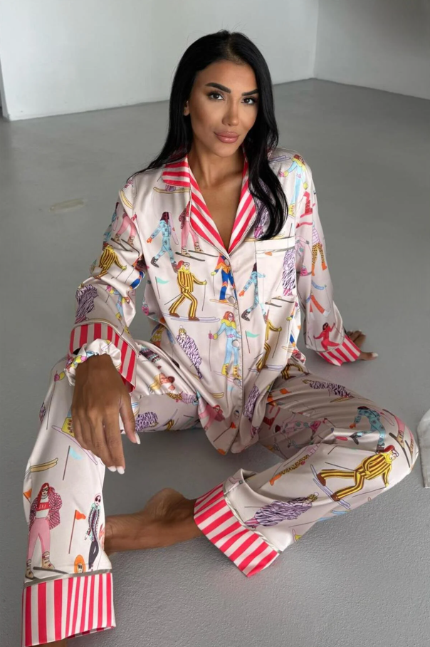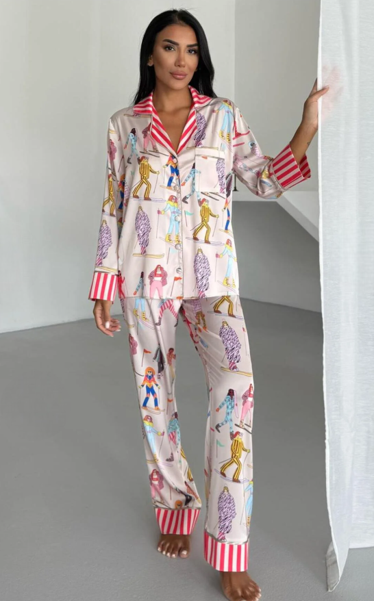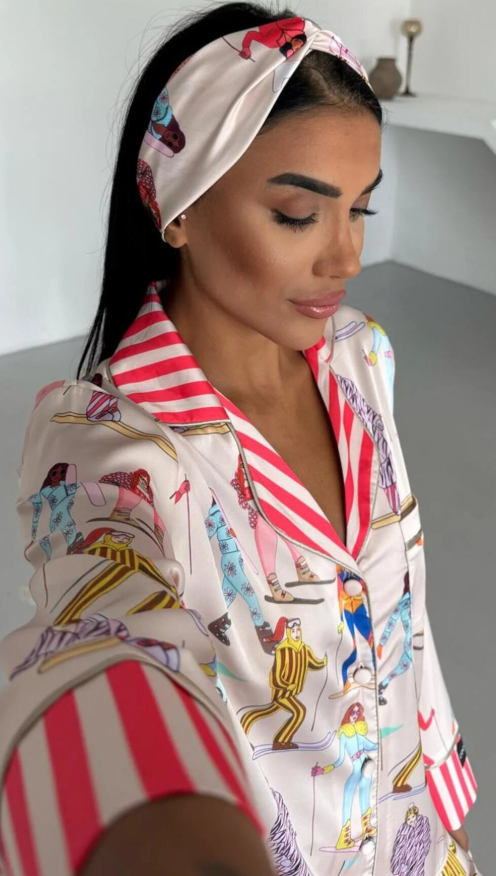 Елегантна дамска сатенена пижама с подарък- лента и скрънчи за коса. Изработена от мек и гладък сатен. Горнището е с дълъг ръкав, копчета по цялата дължина и джобче отпред. Долнището е дълъг панталон с еластичен колан.