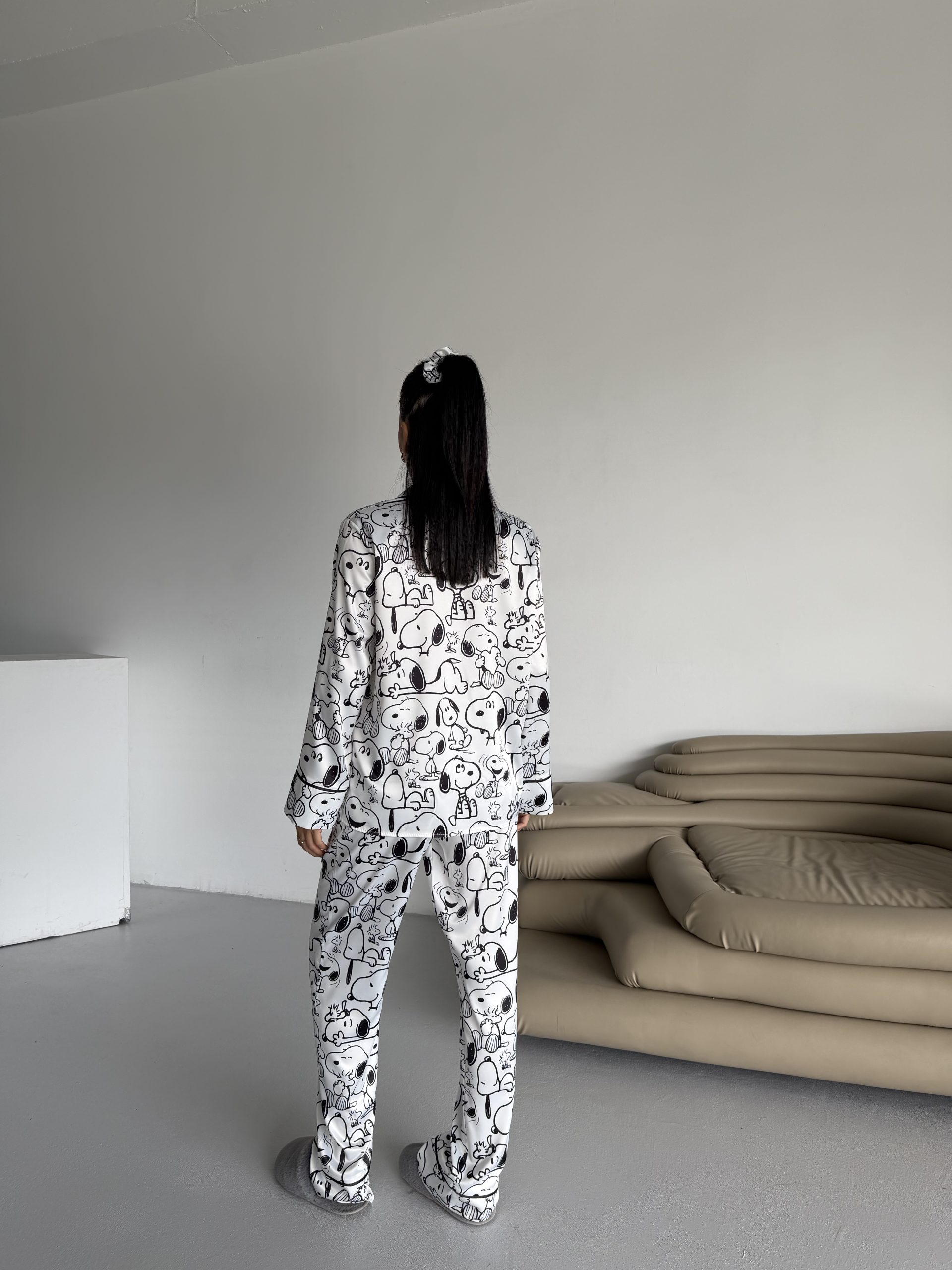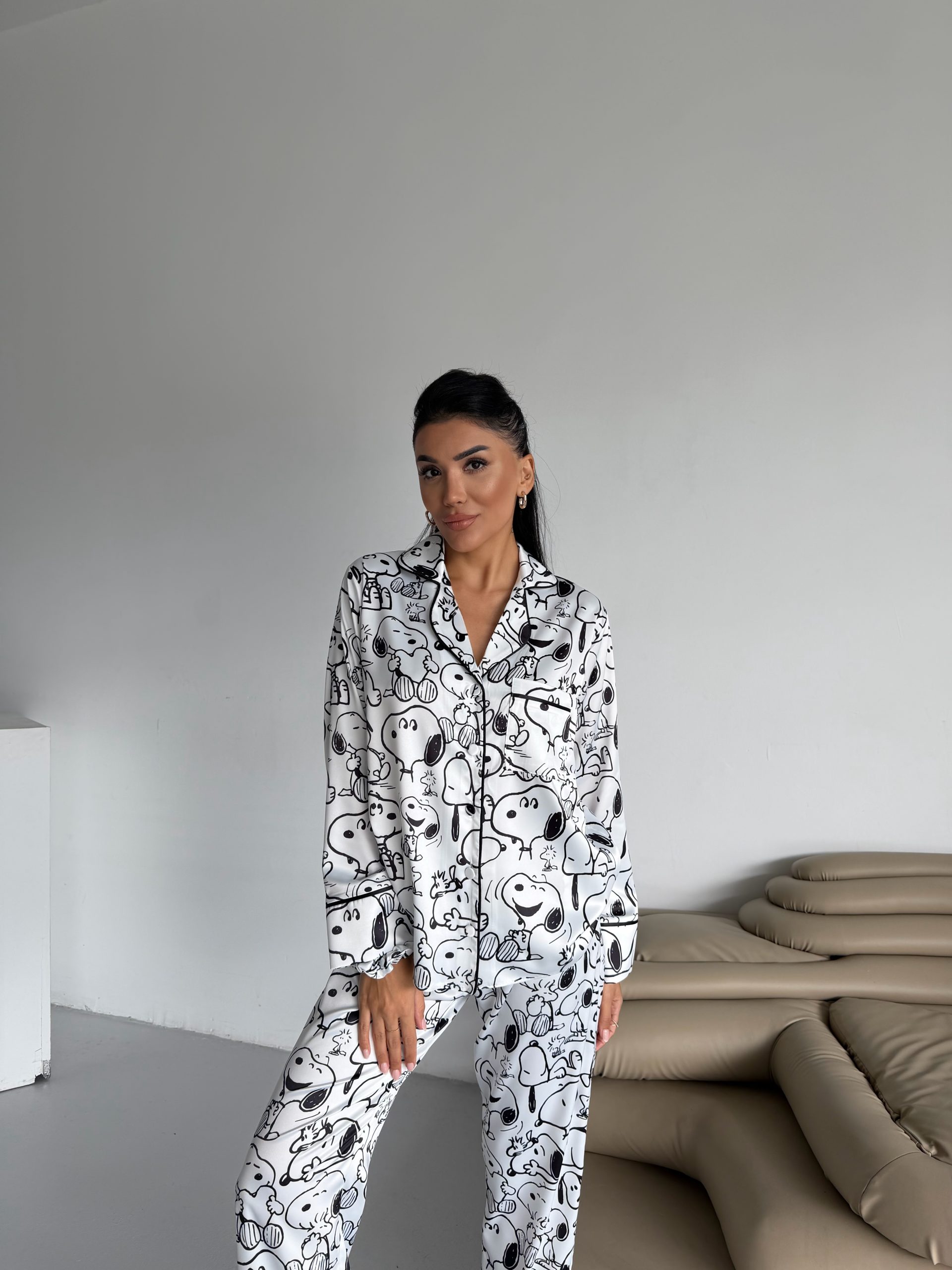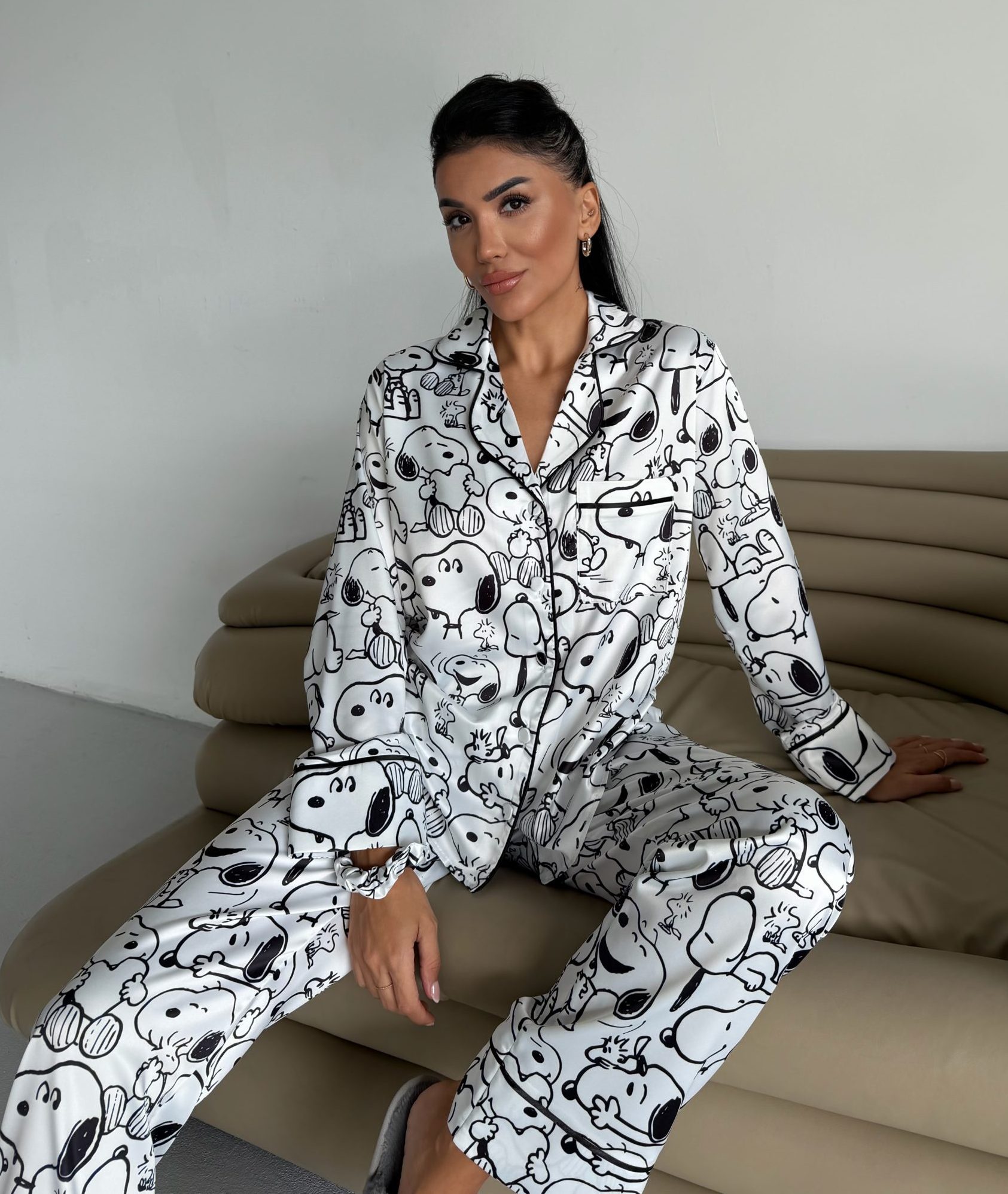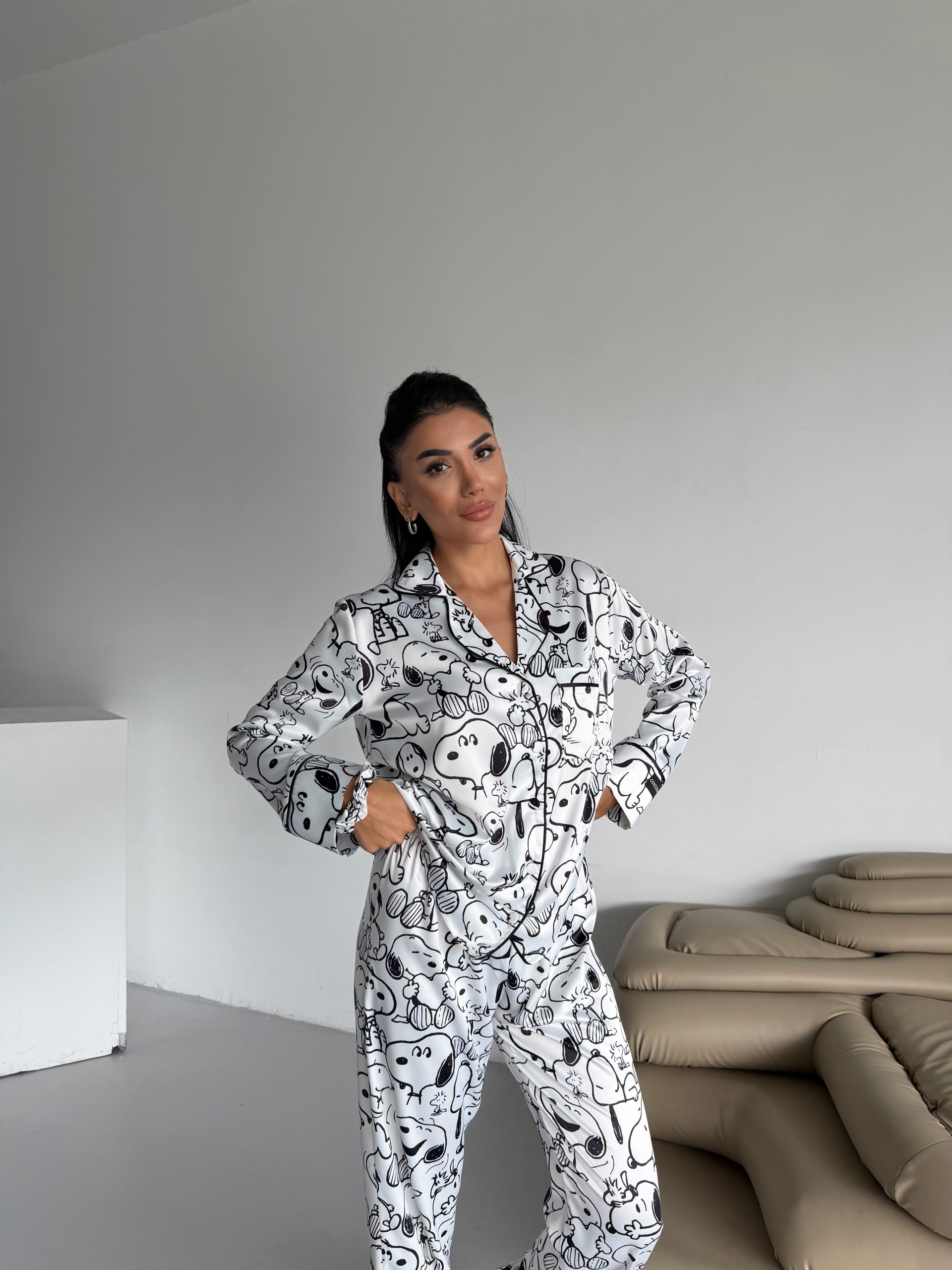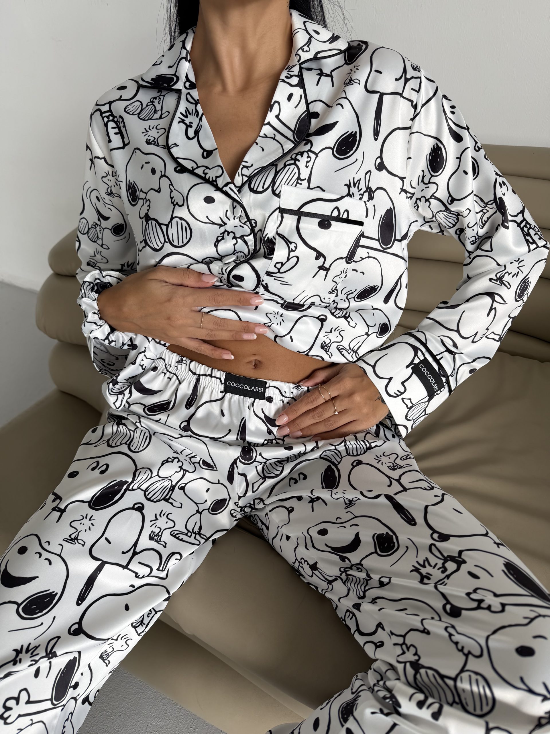 Елегантен сатенен комплект от две части. Горнище с дълъг ръкав, с копчета, яка и джоб. Долнището с дълъг прав широк крачол и ластик в талията. Към комплекта имате подарък скрънч в същият десен. Този сатенен сет е идеален избор както за домашен уют, така и за стилен подарък. Материята е мека, нежна към кожата и придава усещане за лукс.