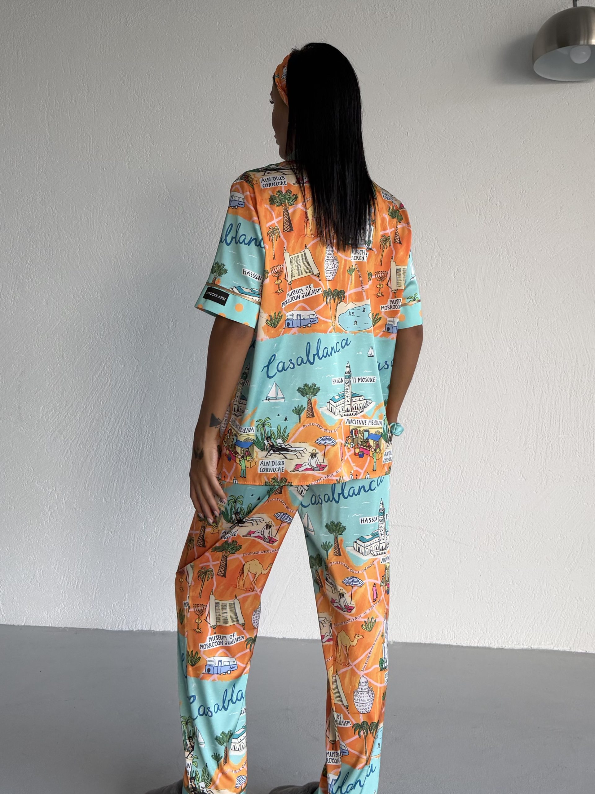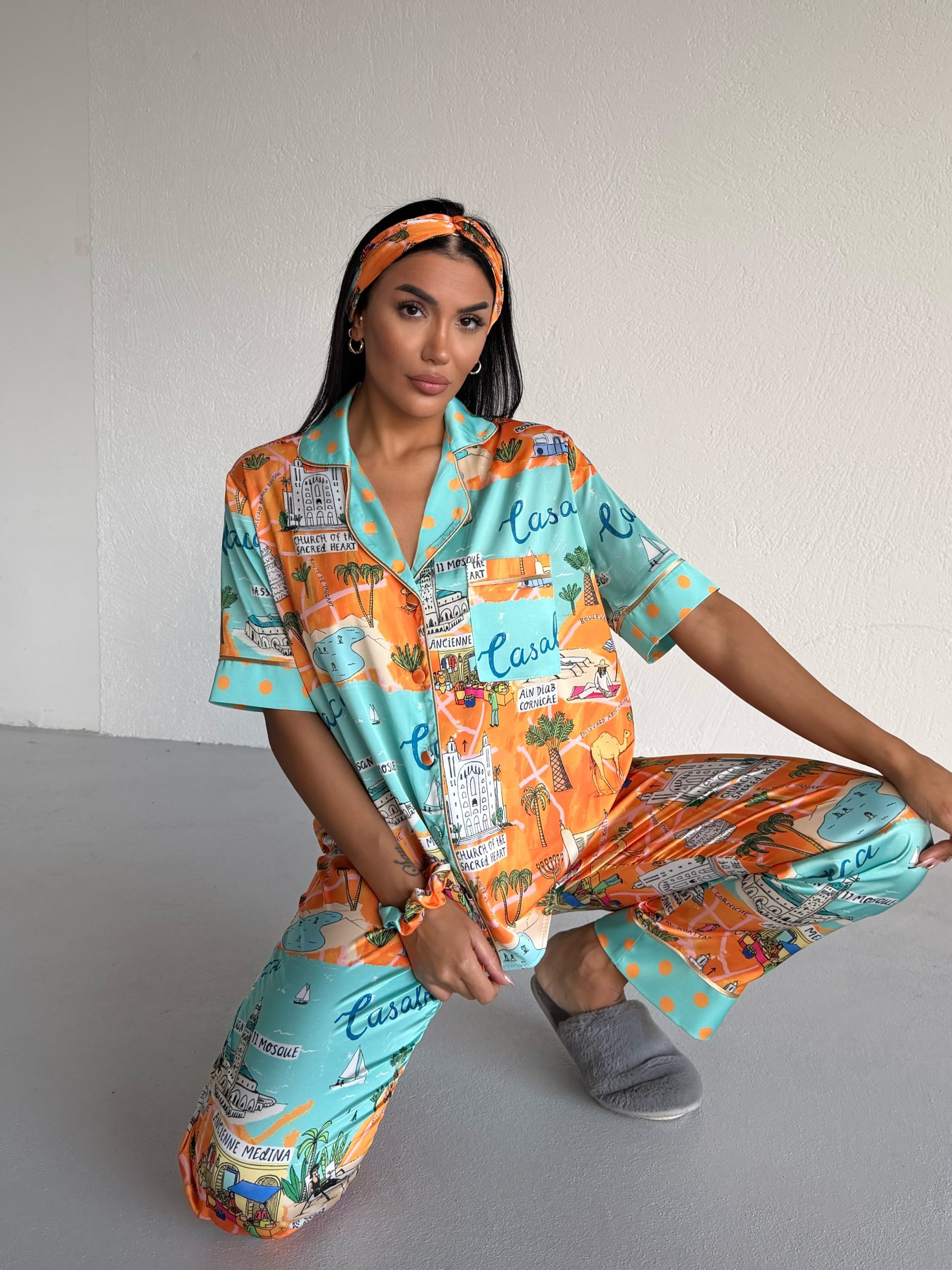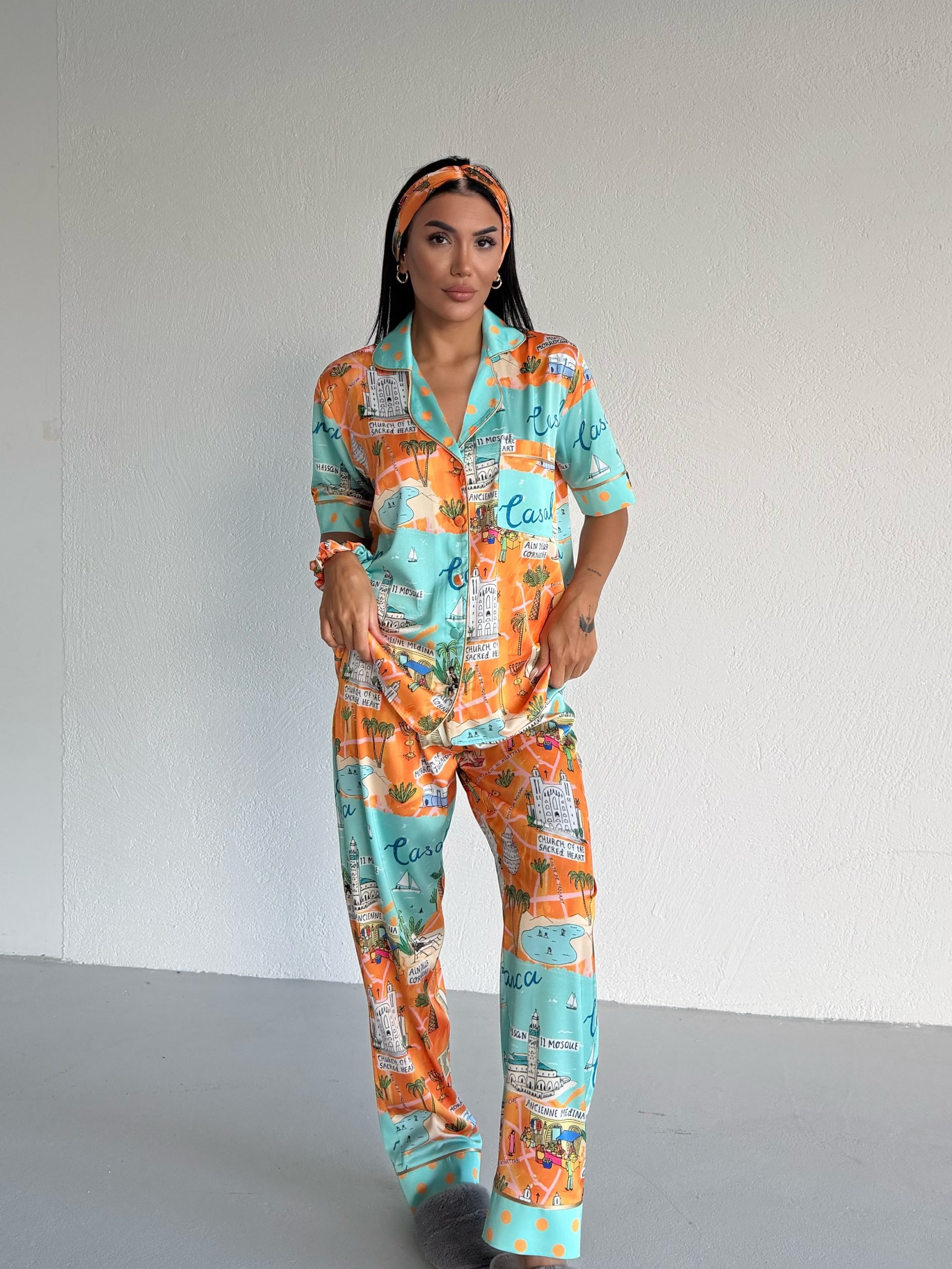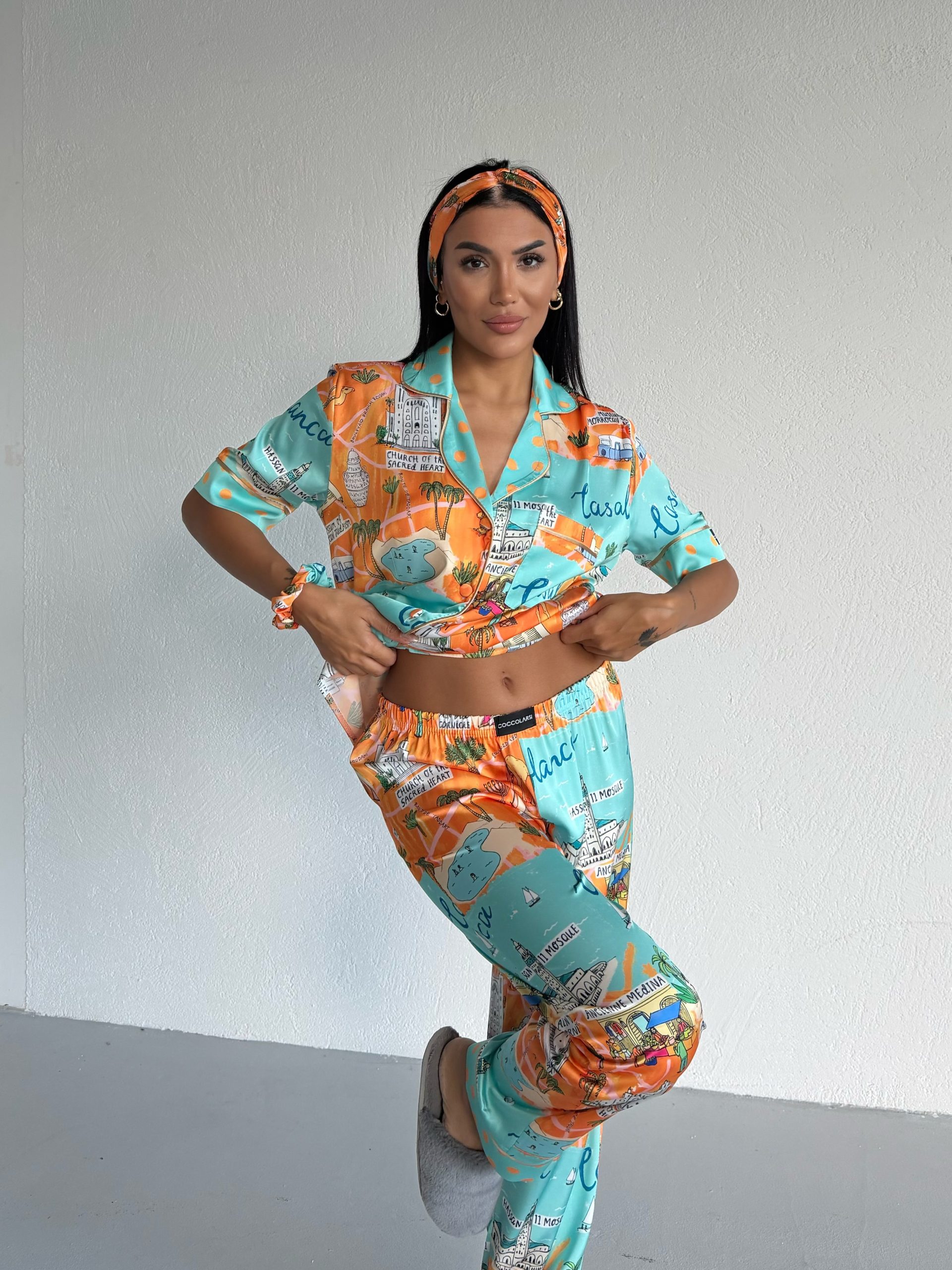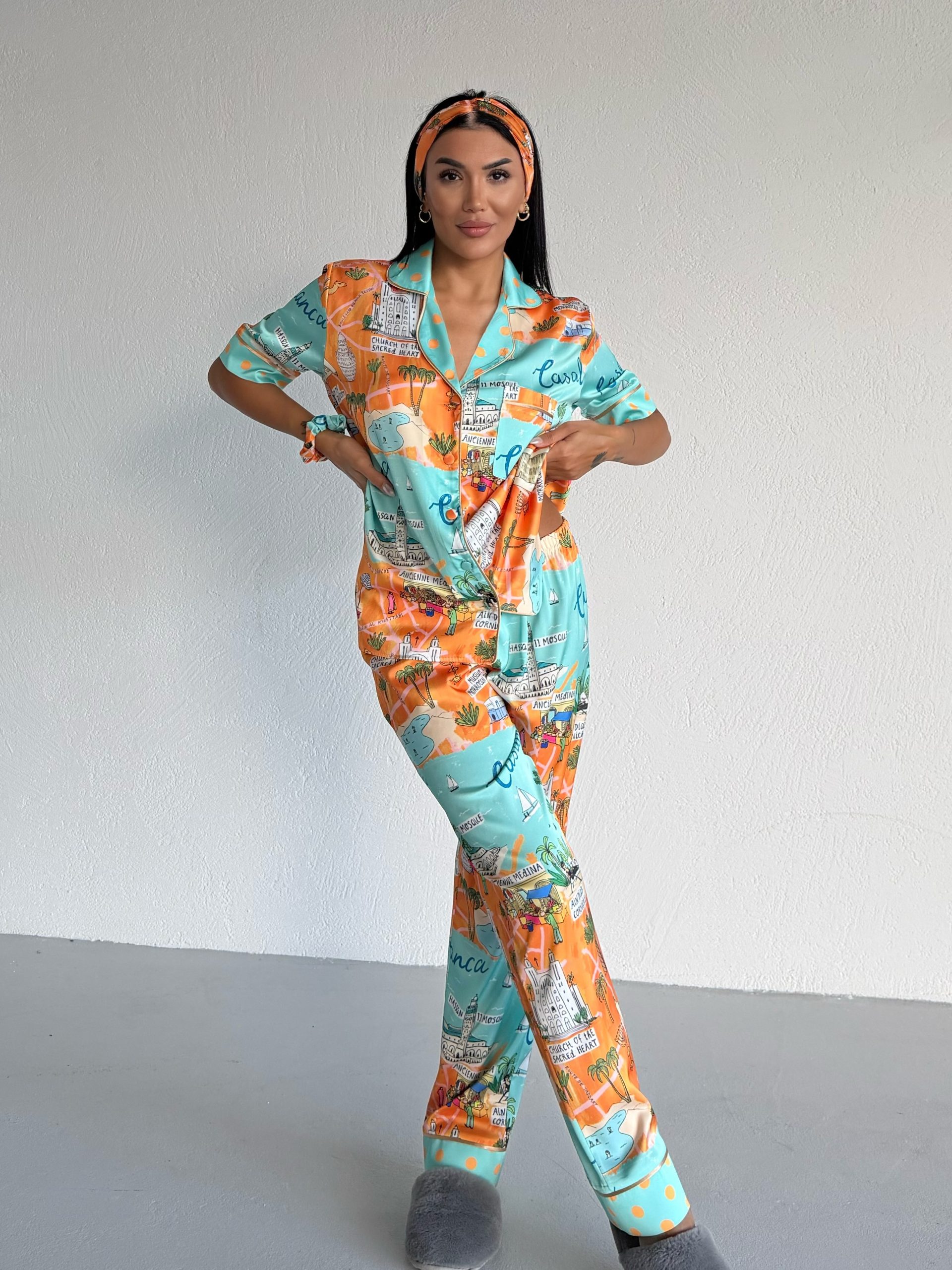 Елегантна дамска сатенена пижама с подарък- лента и скрънчи за коса. Изработена от мек и гладък сатен. Горнището е с къс ръкав, копчета по цялата дължина и джобче отпред. Долнището е дълъг панталон с еластичен колан.