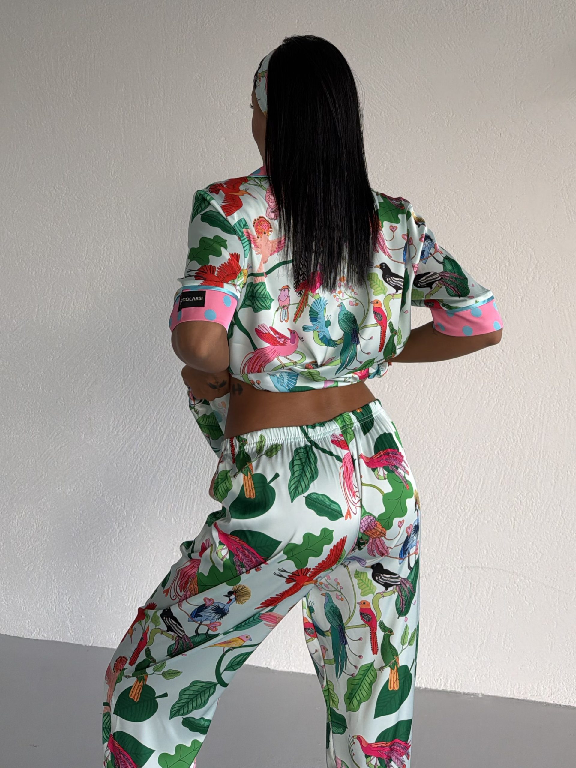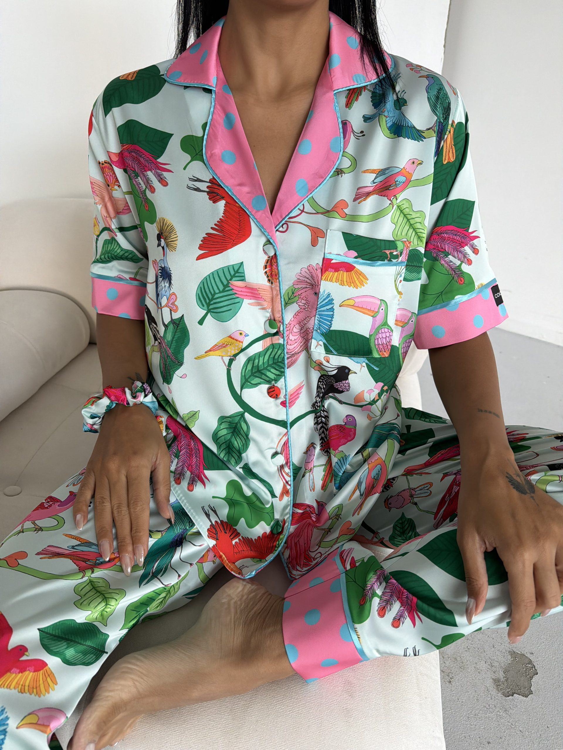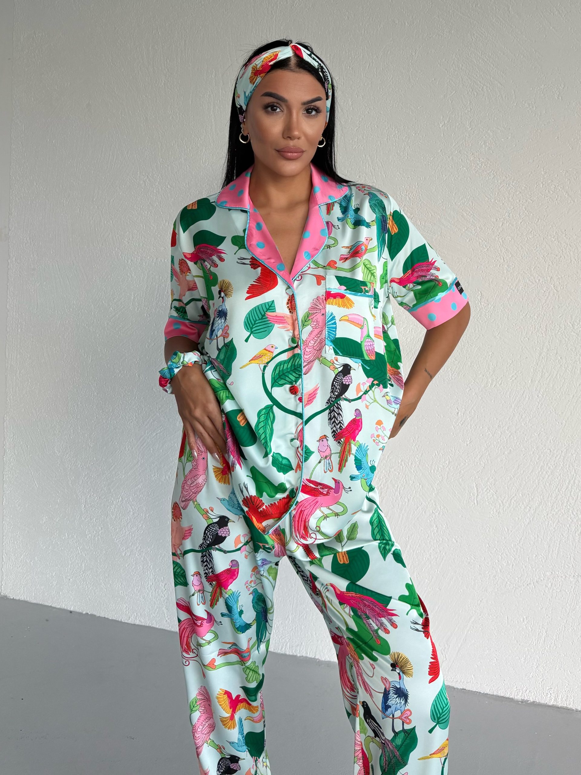 Елегантна дамска сатенена пижама с подарък- лента и скрънчи за коса. Изработена от мек и гладък сатен. Горнището е с къс ръкав, копчета по цялата дължина и джобче отпред. Долнището е дълъг панталон с еластичен колан.