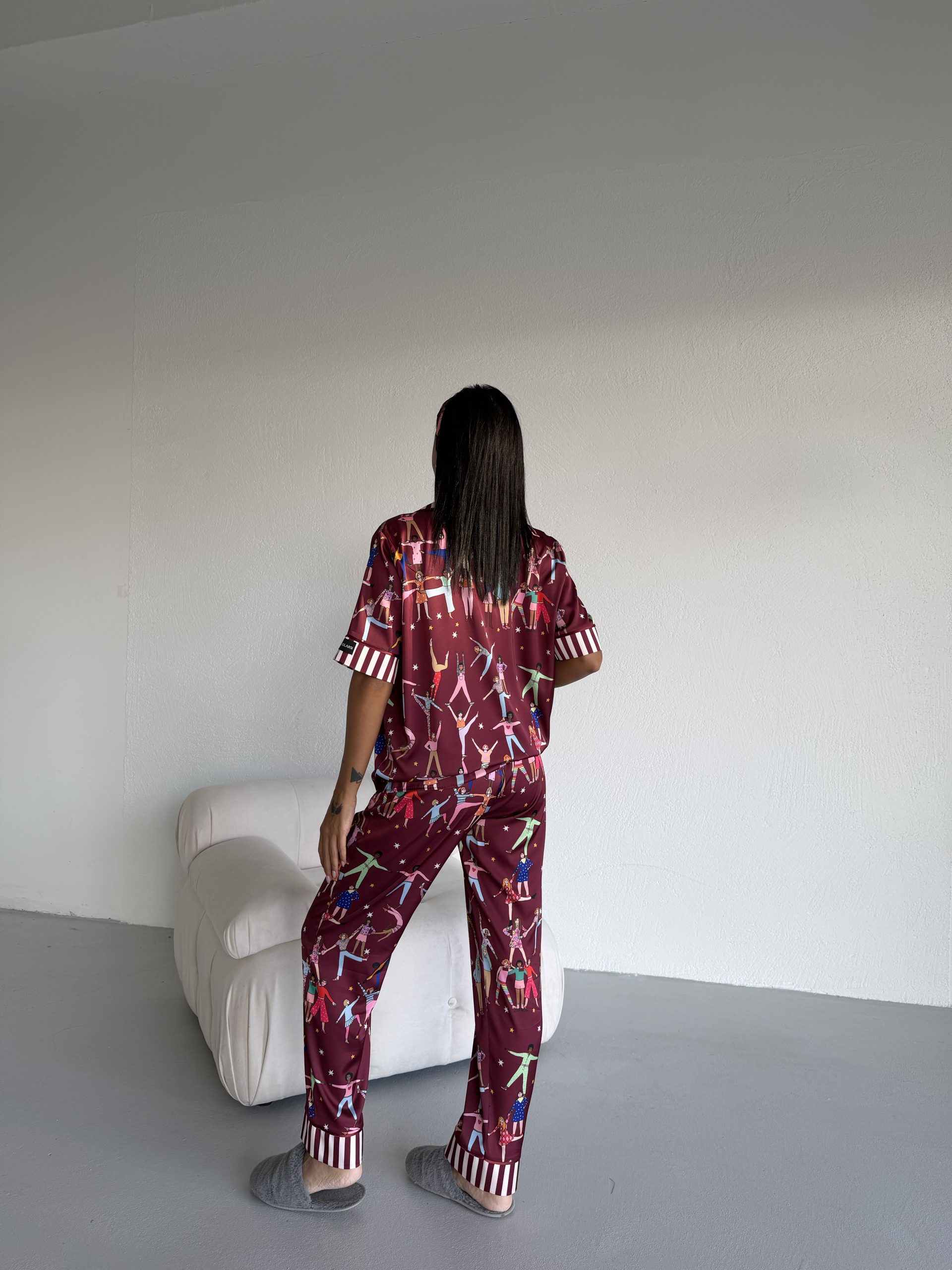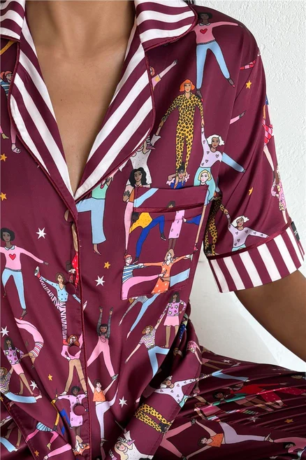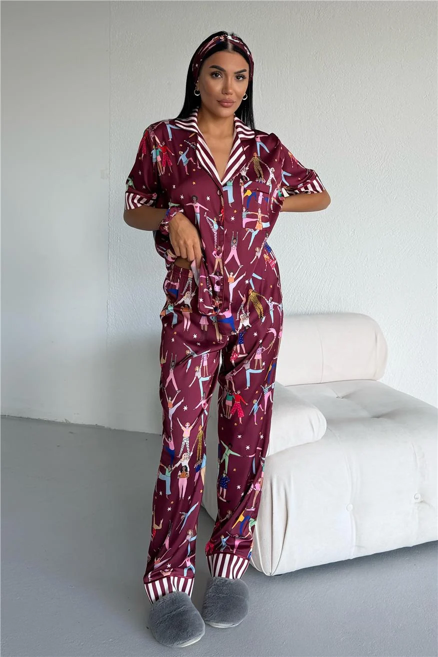 Елегантна дамска сатенена пижама с подарък- лента и скрънчи за коса. Изработена от мек и гладък сатен. Горнището е с къс ръкав, копчета по цялата дължина и джобче отпред. Долнището е дълъг панталон с еластичен колан.