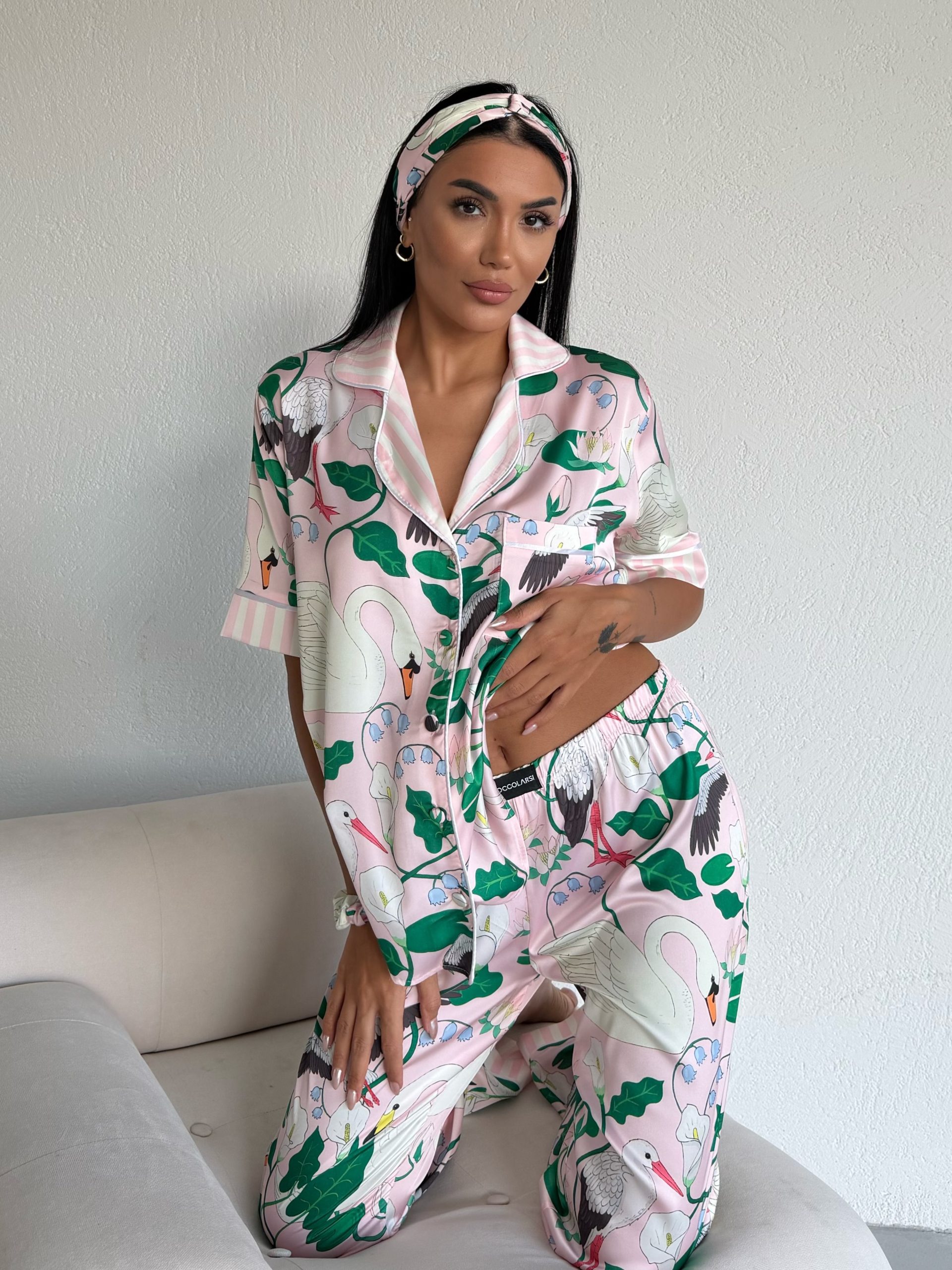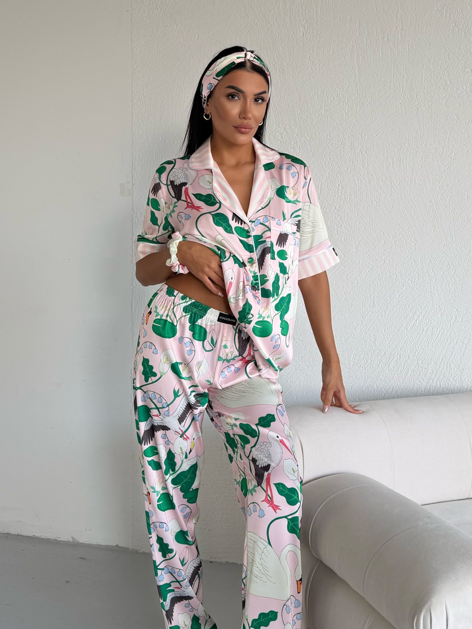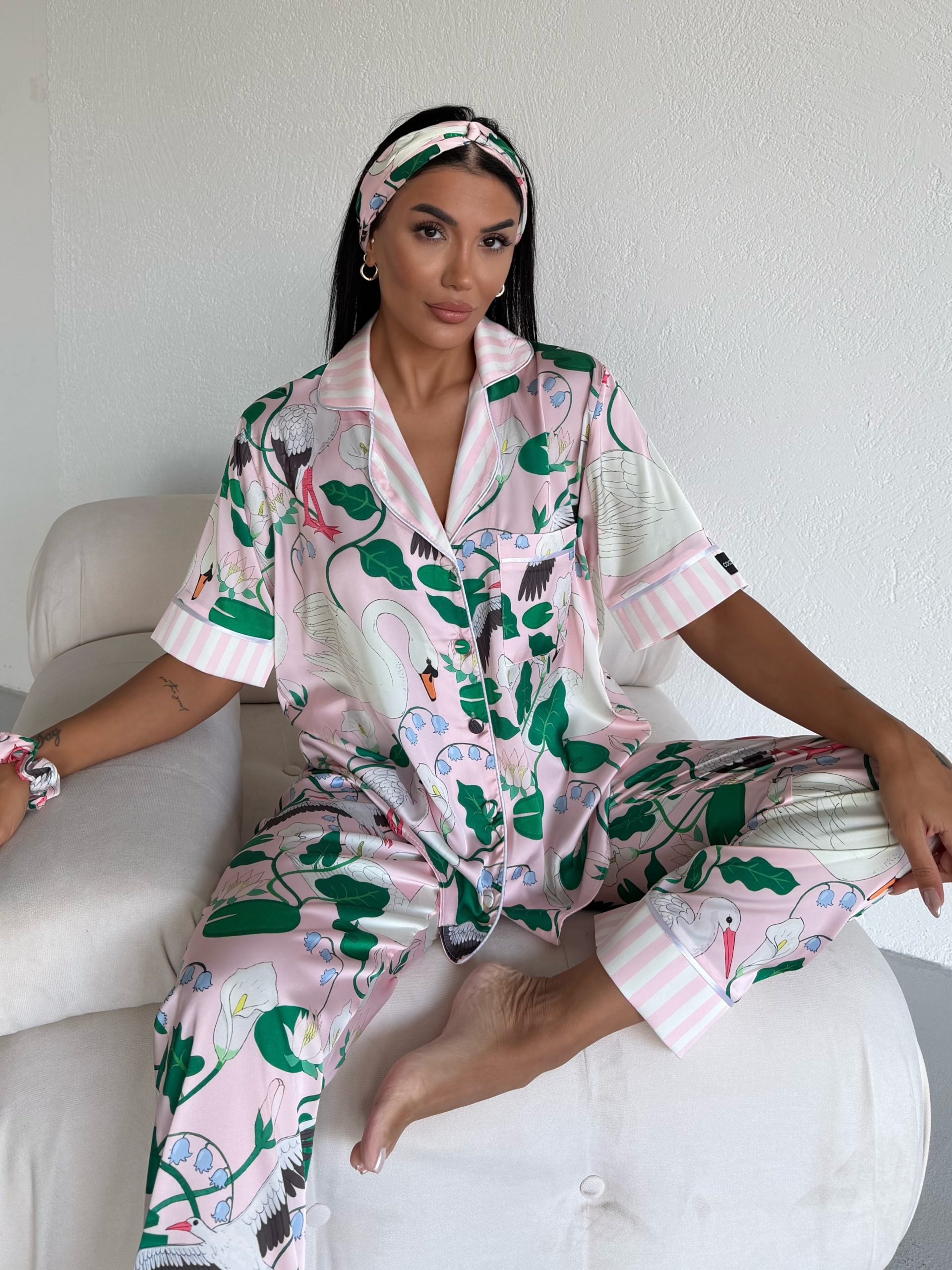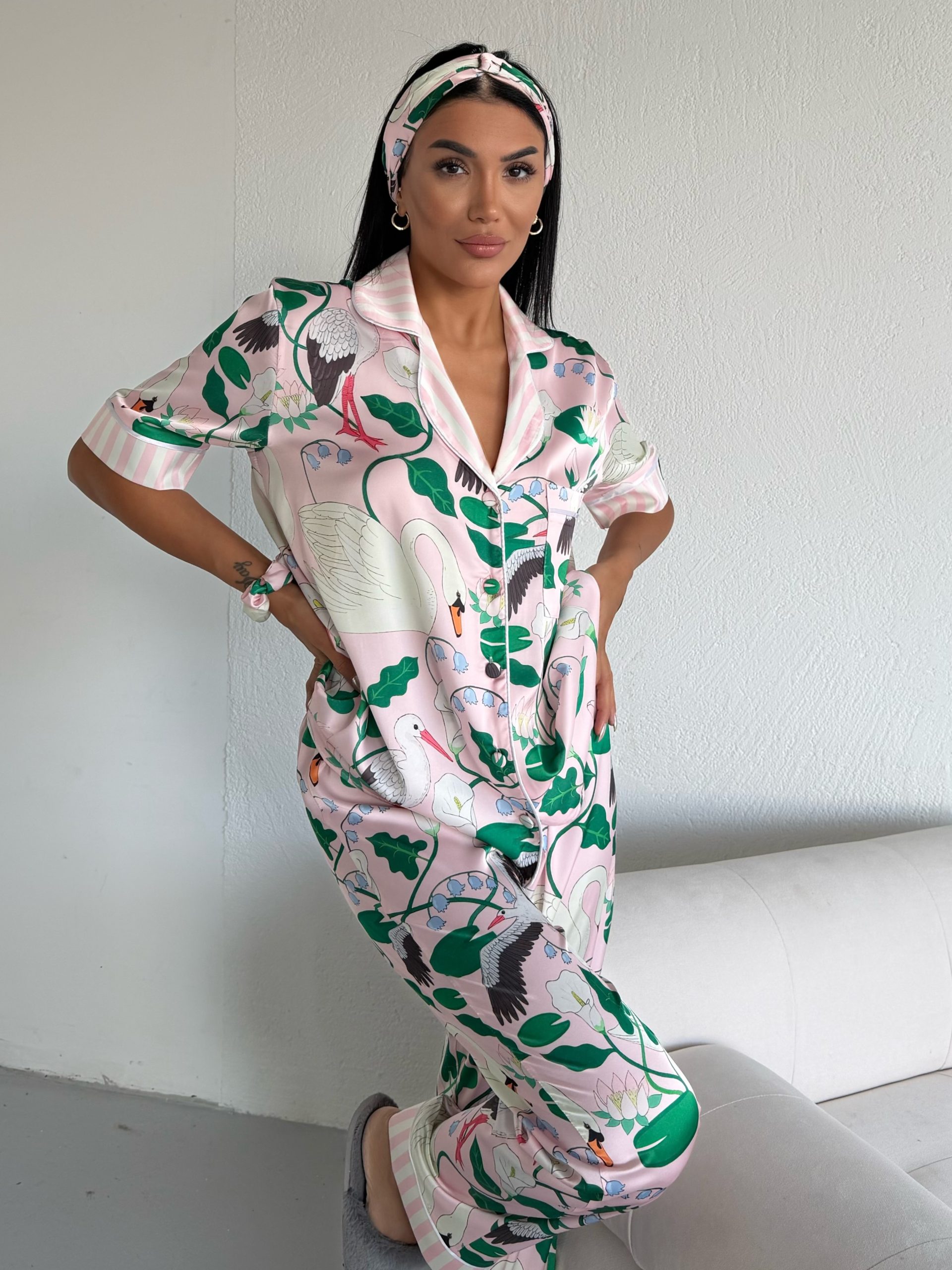 Елегантна дамска сатенена пижама с подарък- лента и скрънчи за коса. Изработена от мек и гладък сатен. Горнището е с къс ръкав, копчета по цялата дължина и джобче отпред. Долнището е дълъг панталон с еластичен колан.