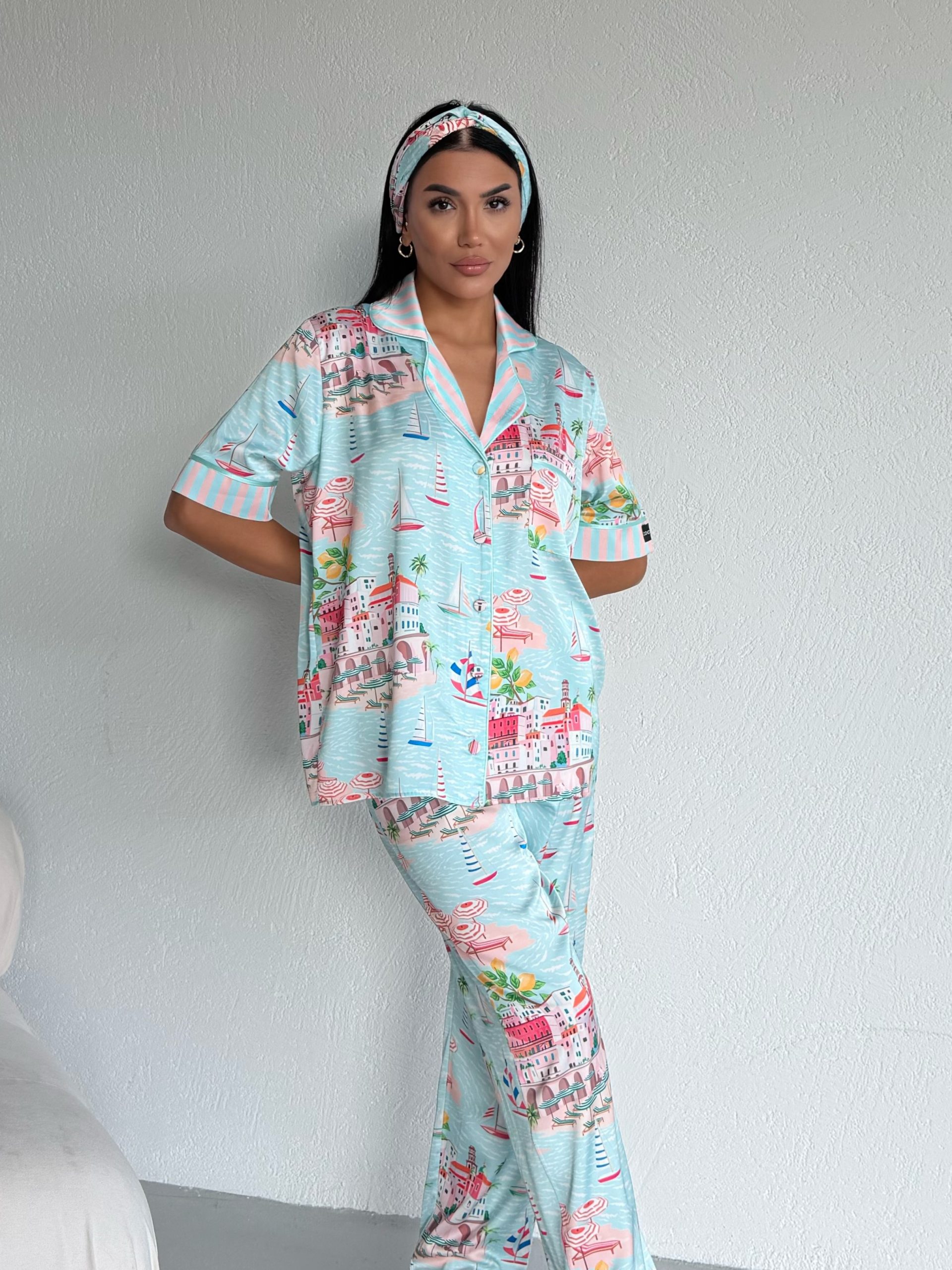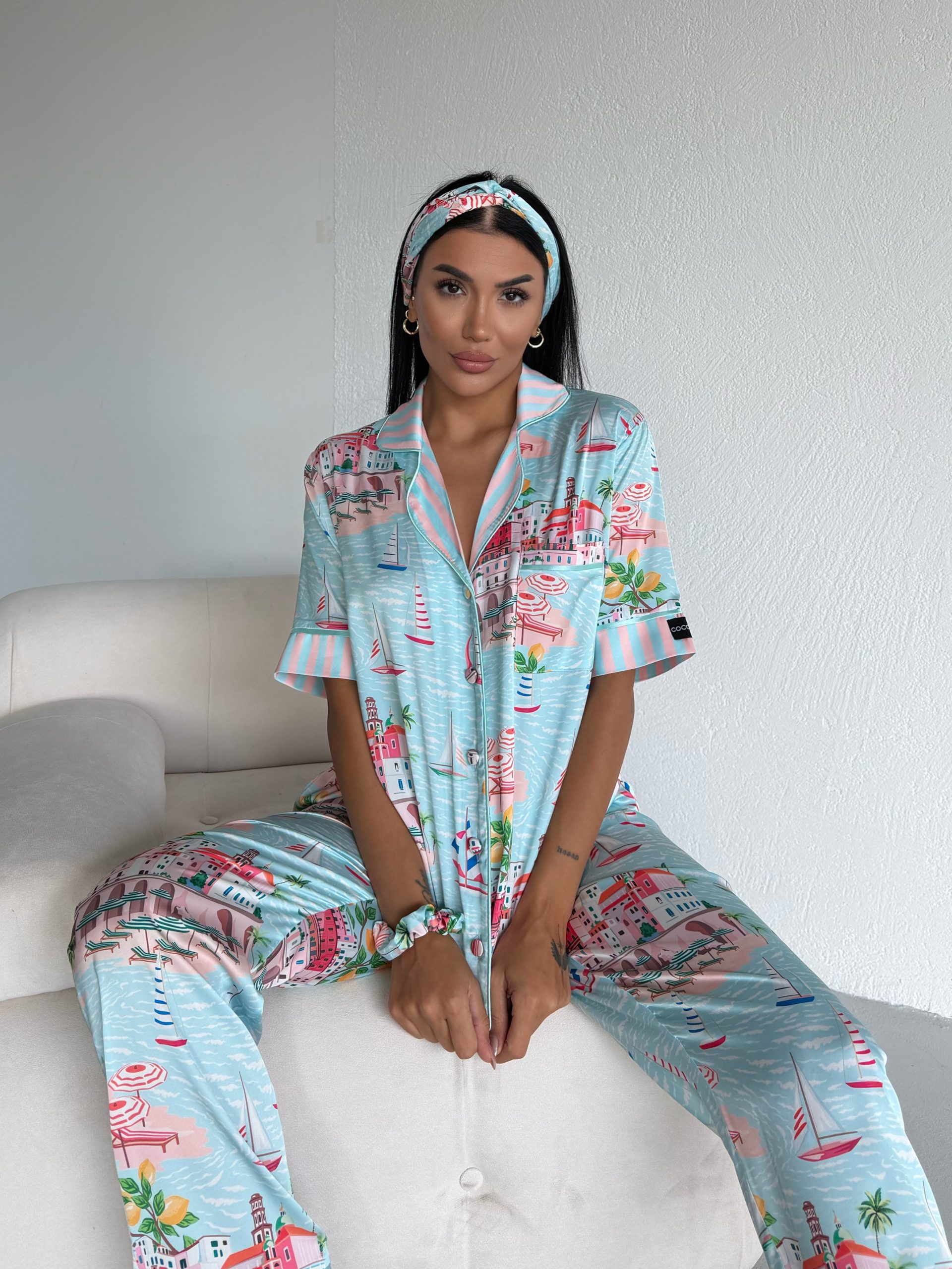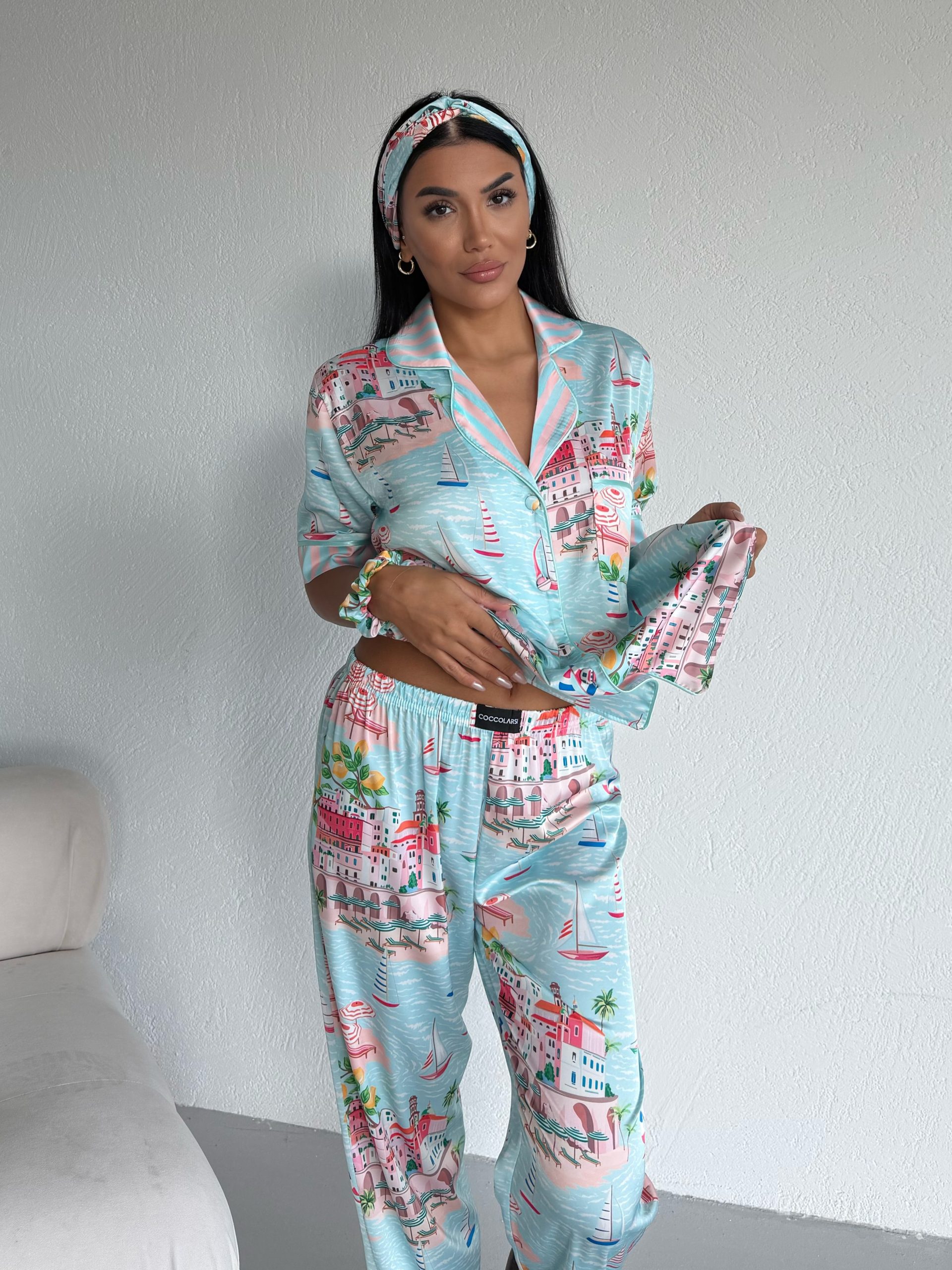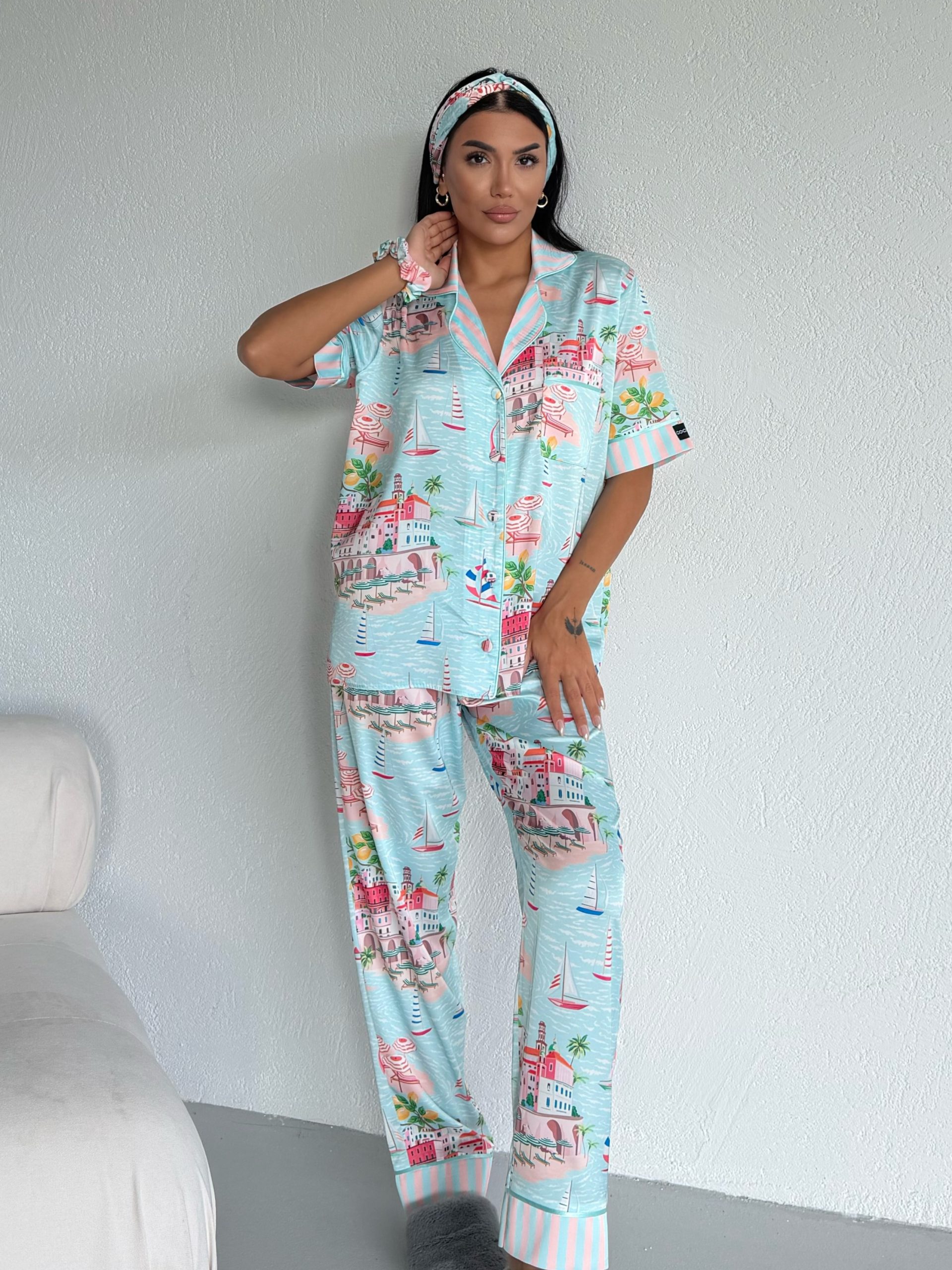Елегантна дамска сатенена пижама с подарък- лента и скрънчи за коса. Изработена от мек и гладък сатен. Горнището е с къс ръкав, копчета по цялата дължина и джобче отпред. Долнището е дълъг панталон с еластичен колан.