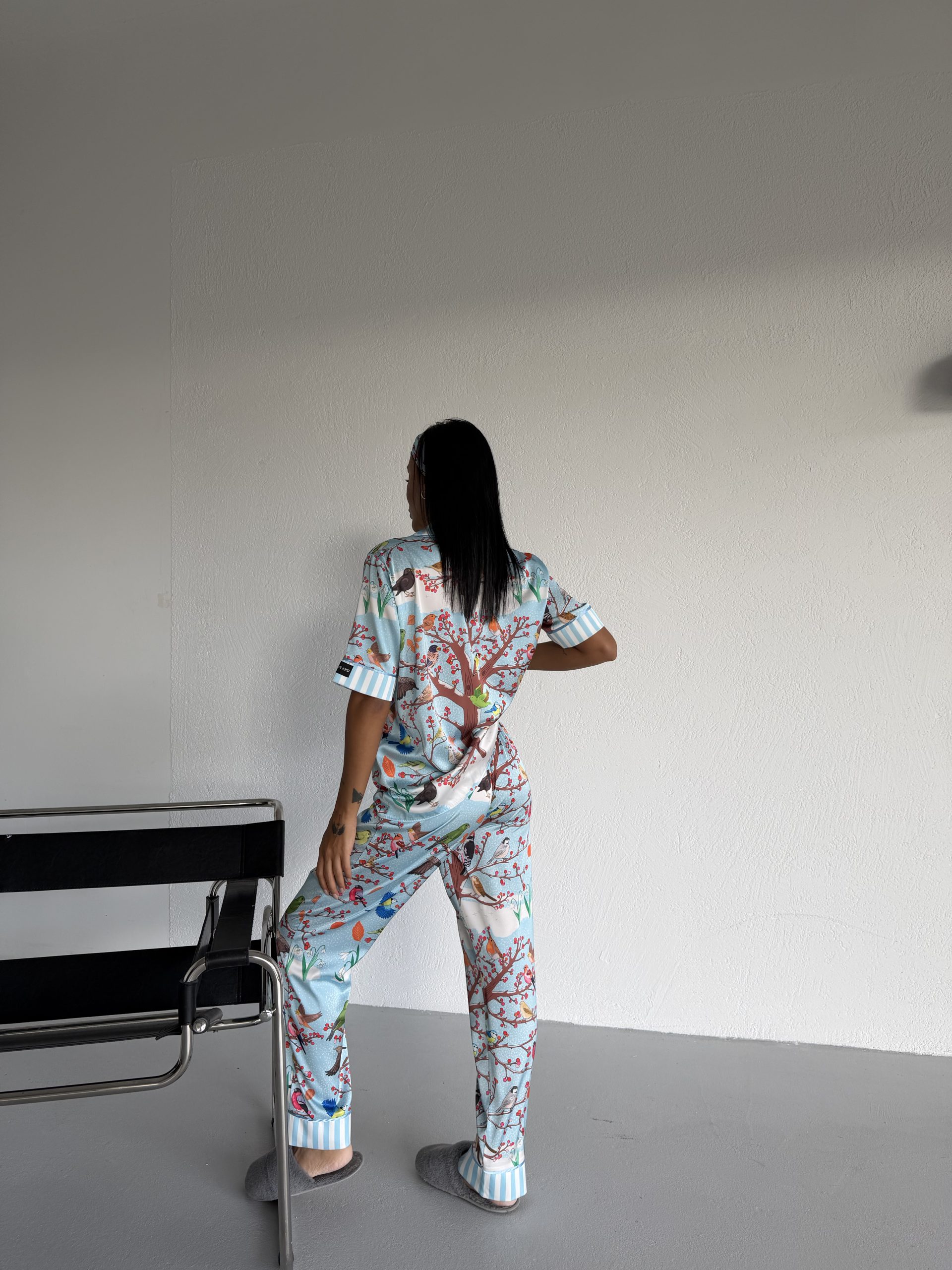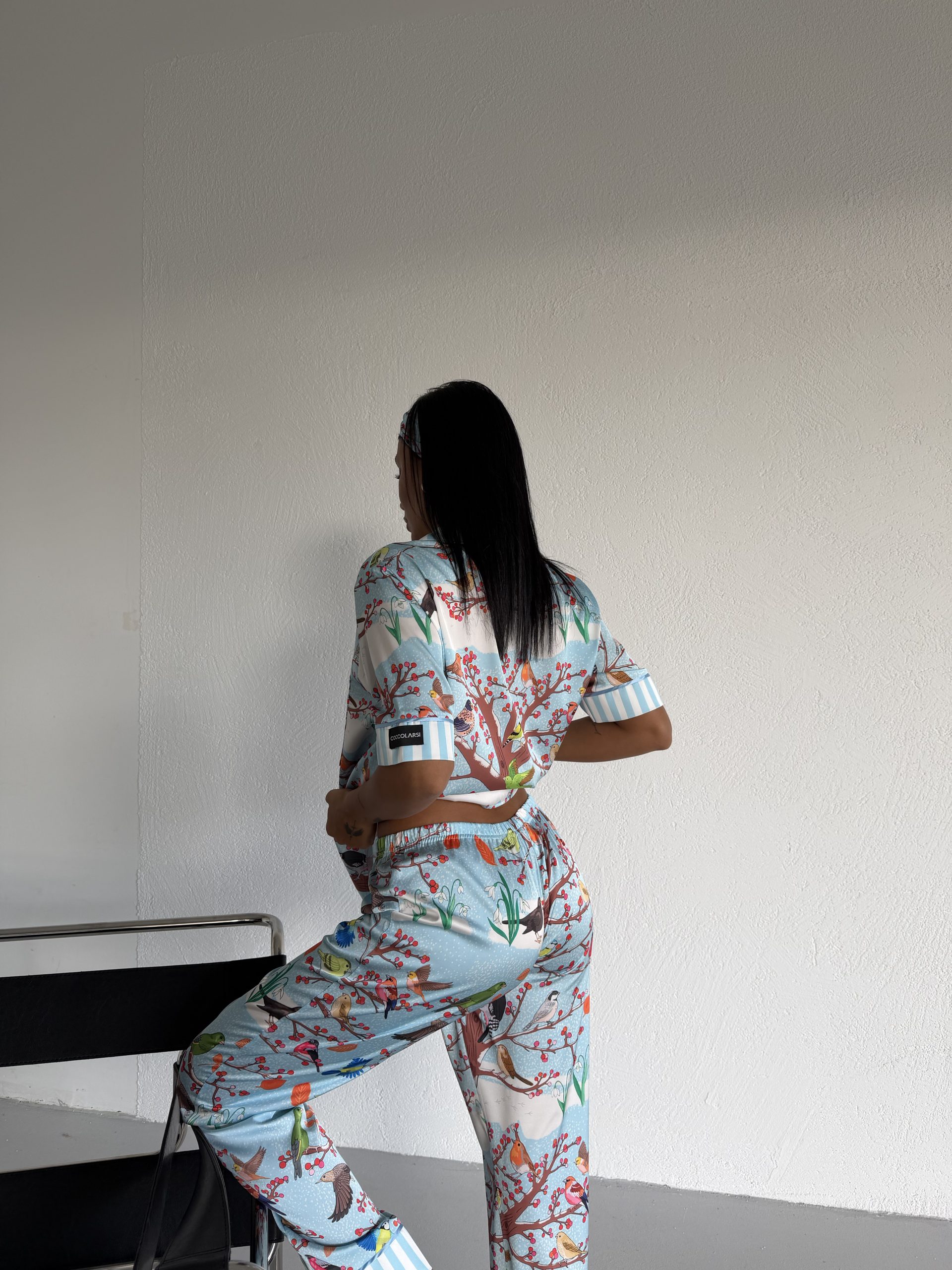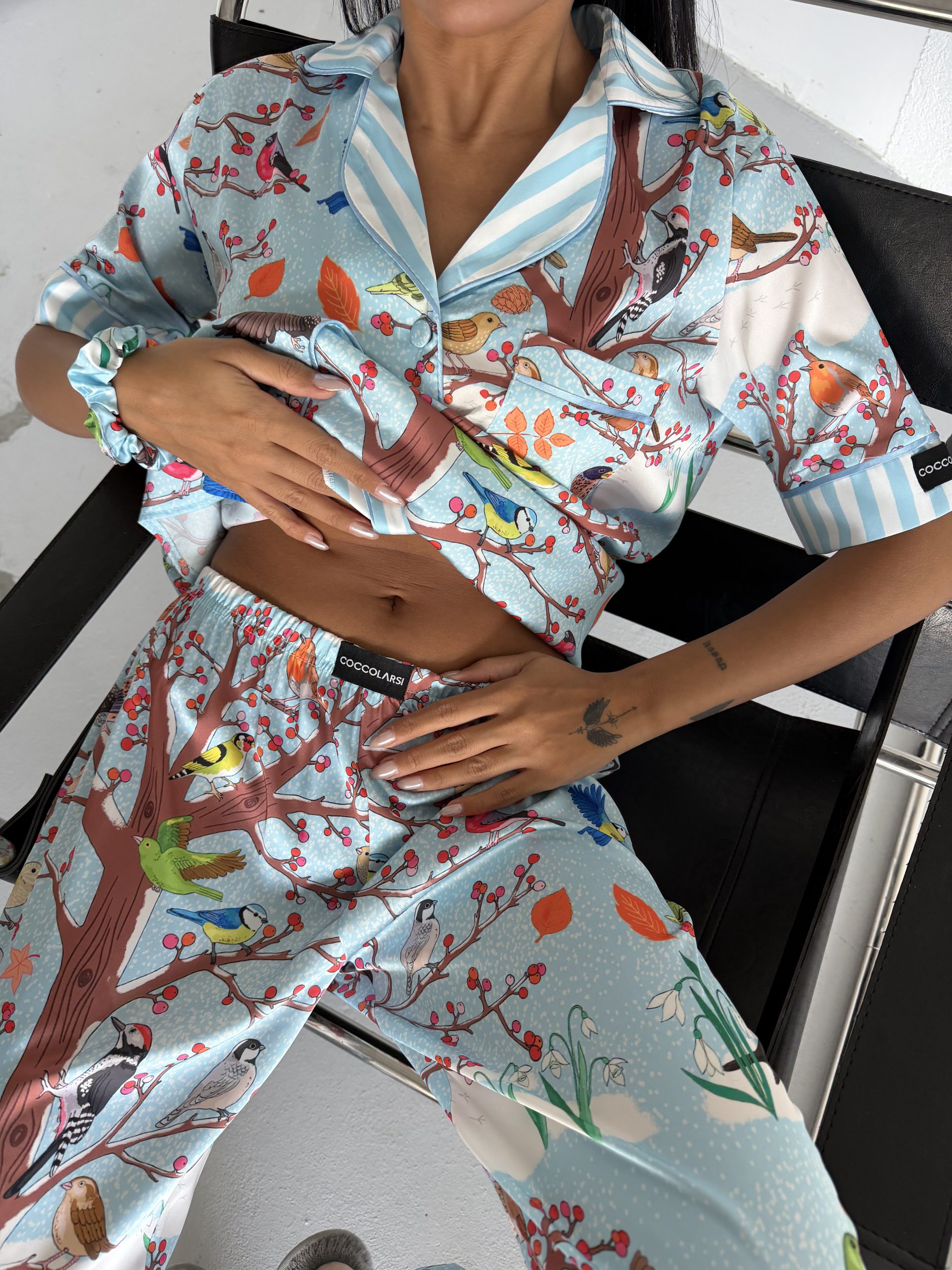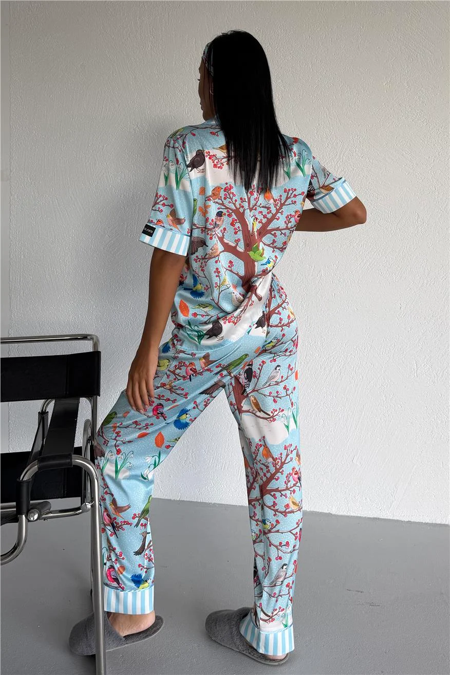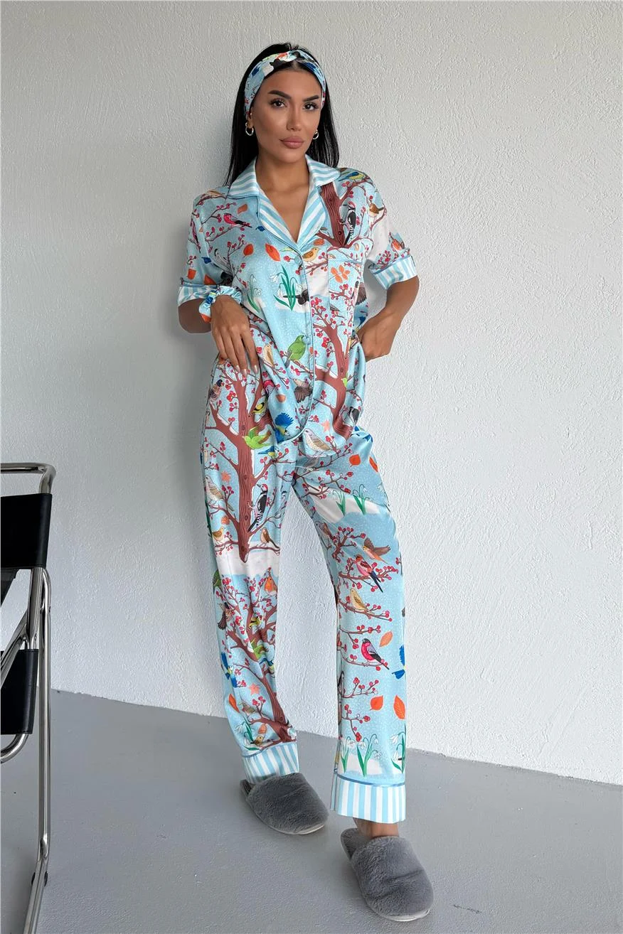 Елегантна дамска сатенена пижама с подарък- лента и скрънчи за коса. Изработена от мек и гладък сатен. Горнището е с къс ръкав, копчета по цялата дължина и джобче отпред. Долнището е дълъг панталон с еластичен колан.