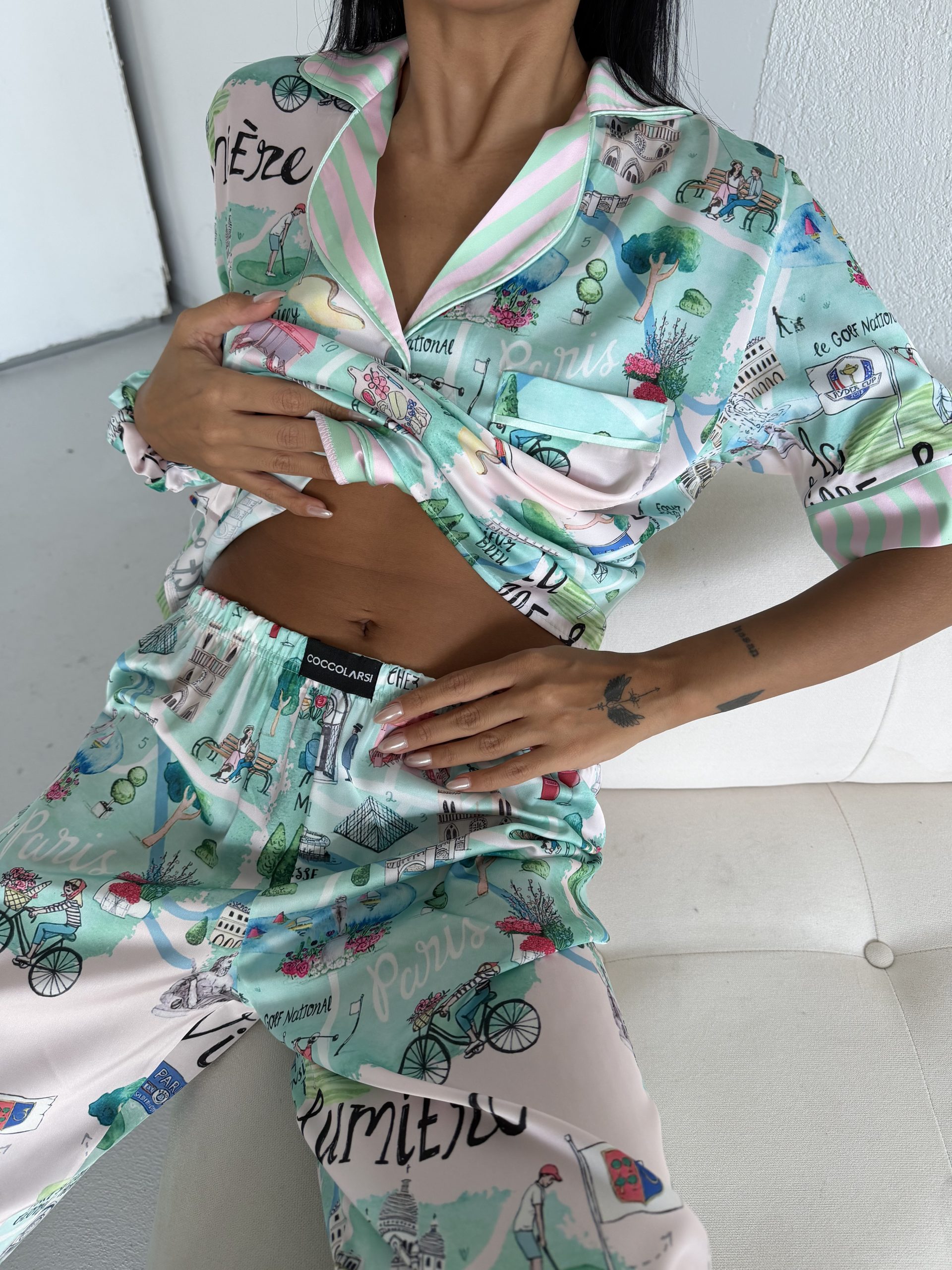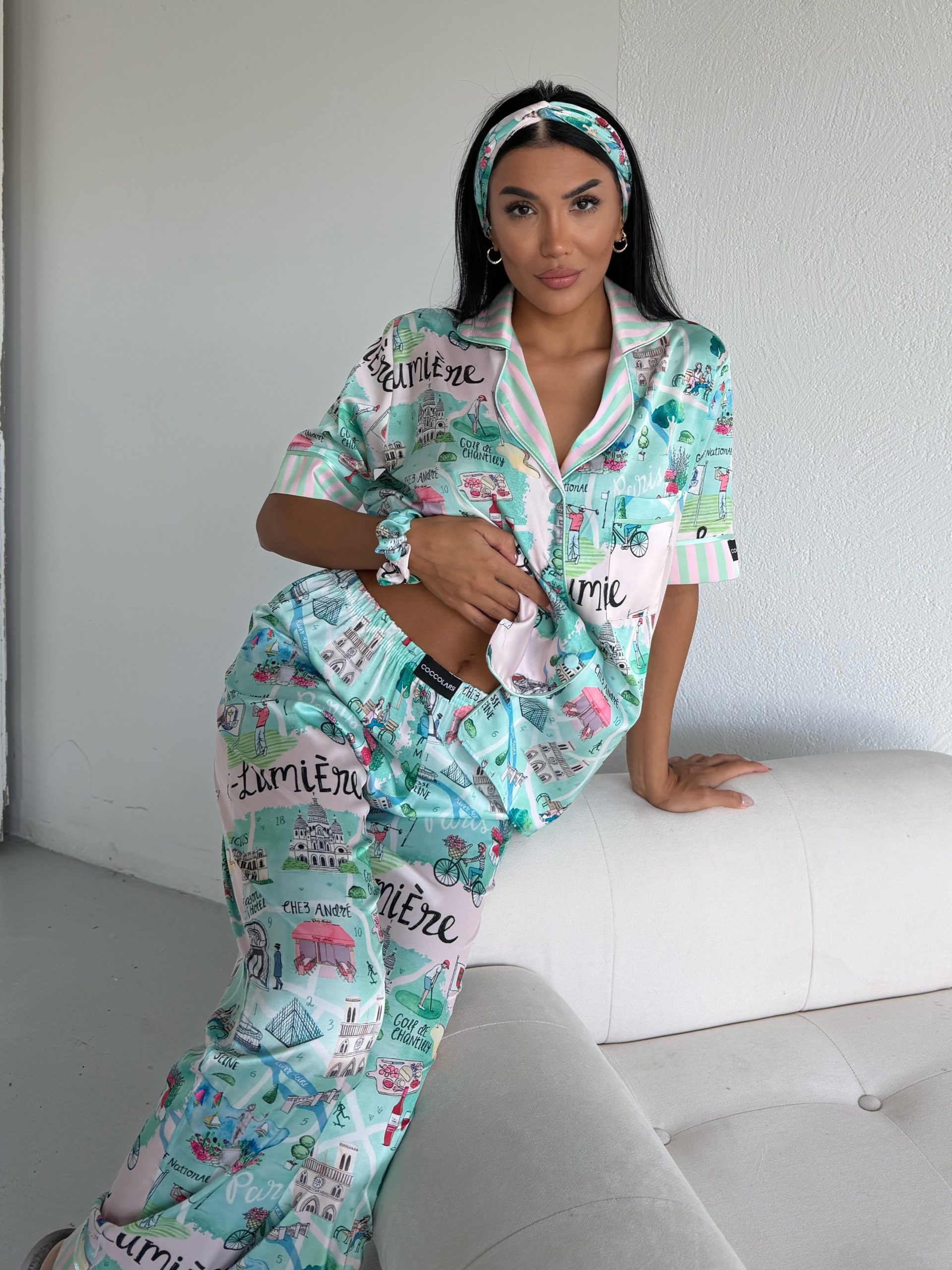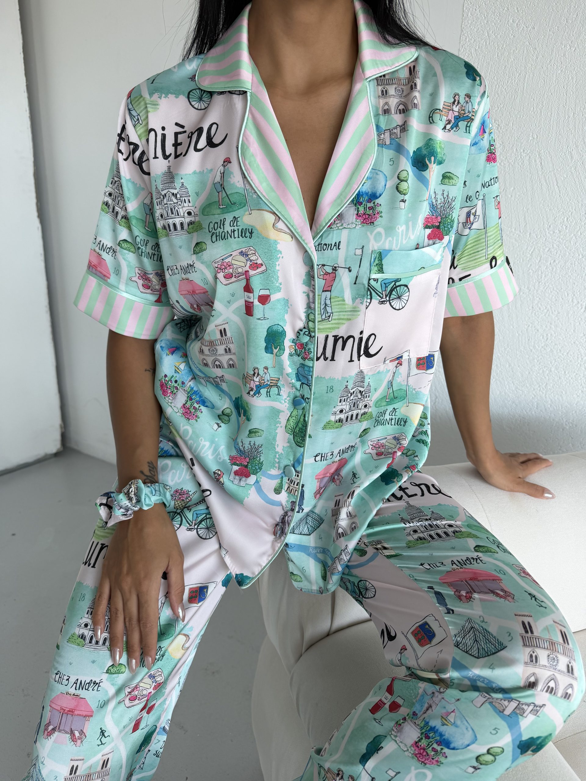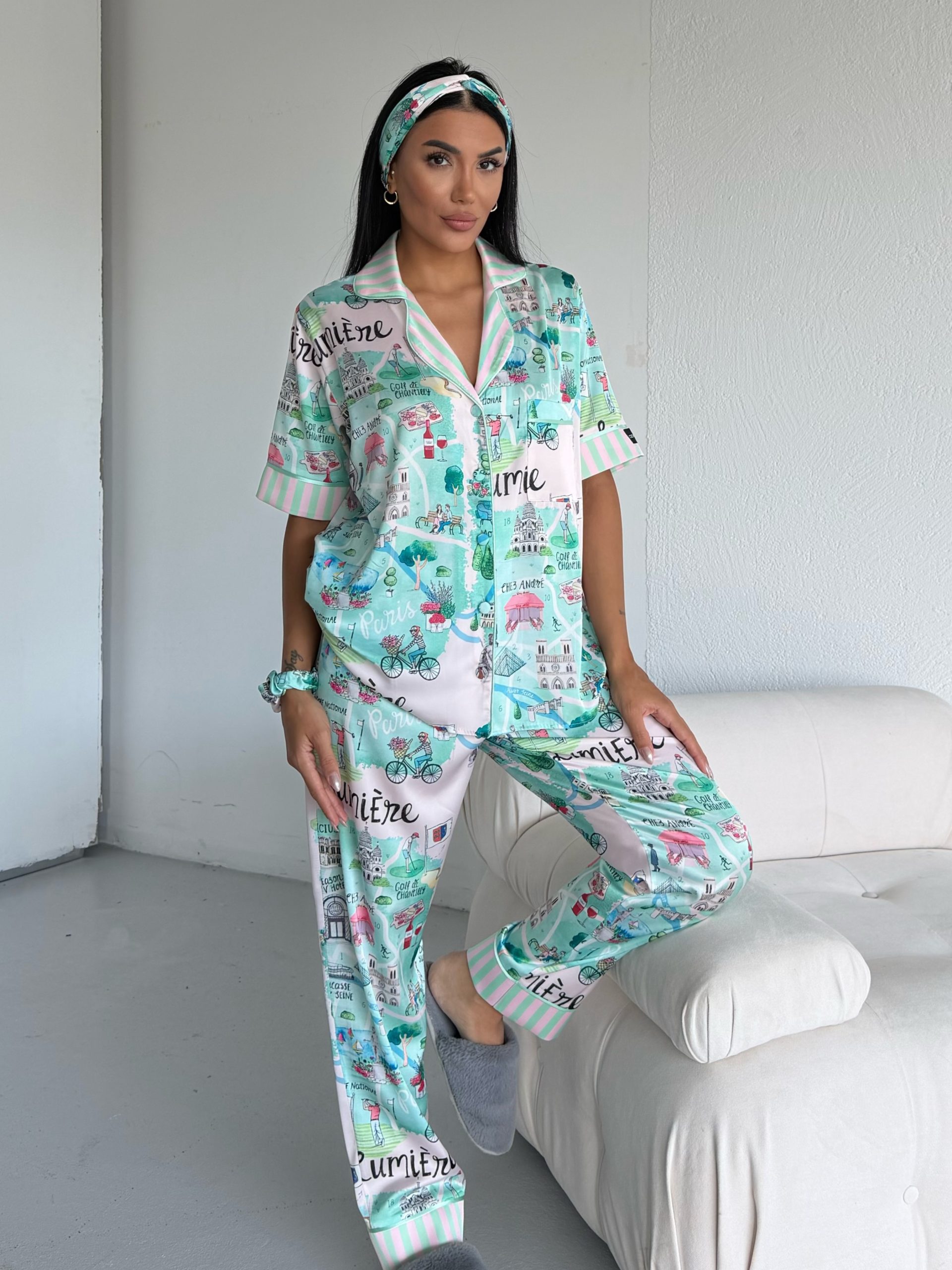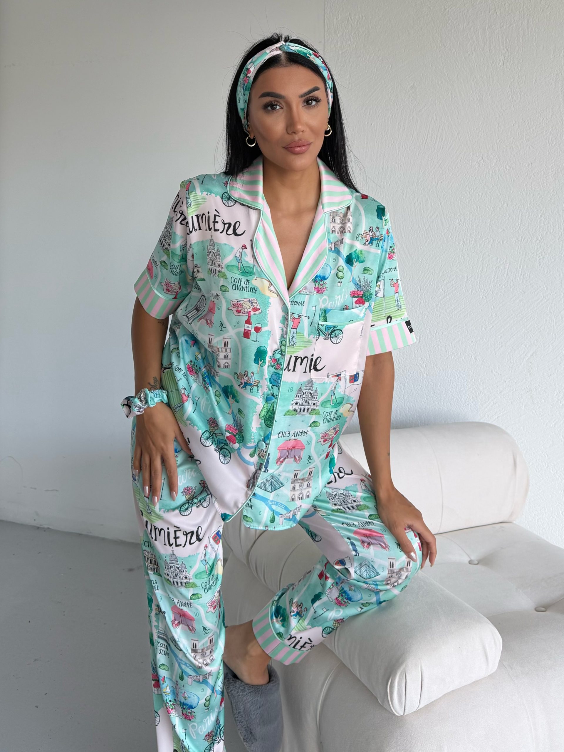 Елегантна дамска сатенена пижама с подарък- лента и скрънчи за коса. Изработена от мек и гладък сатен. Горнището е с къс ръкав, копчета по цялата дължина и джобче отпред. Долнището е дълъг панталон с еластичен колан.