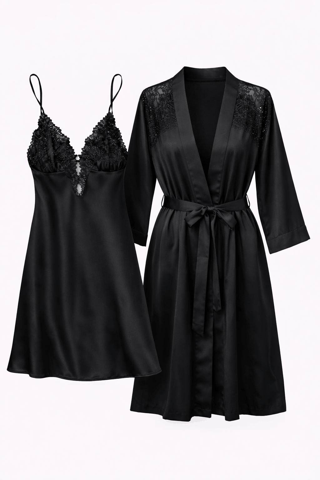 Луксозен комплект от сатен: нощница с дантела и елегантен халат. Секси дизайн и копринено усещане.