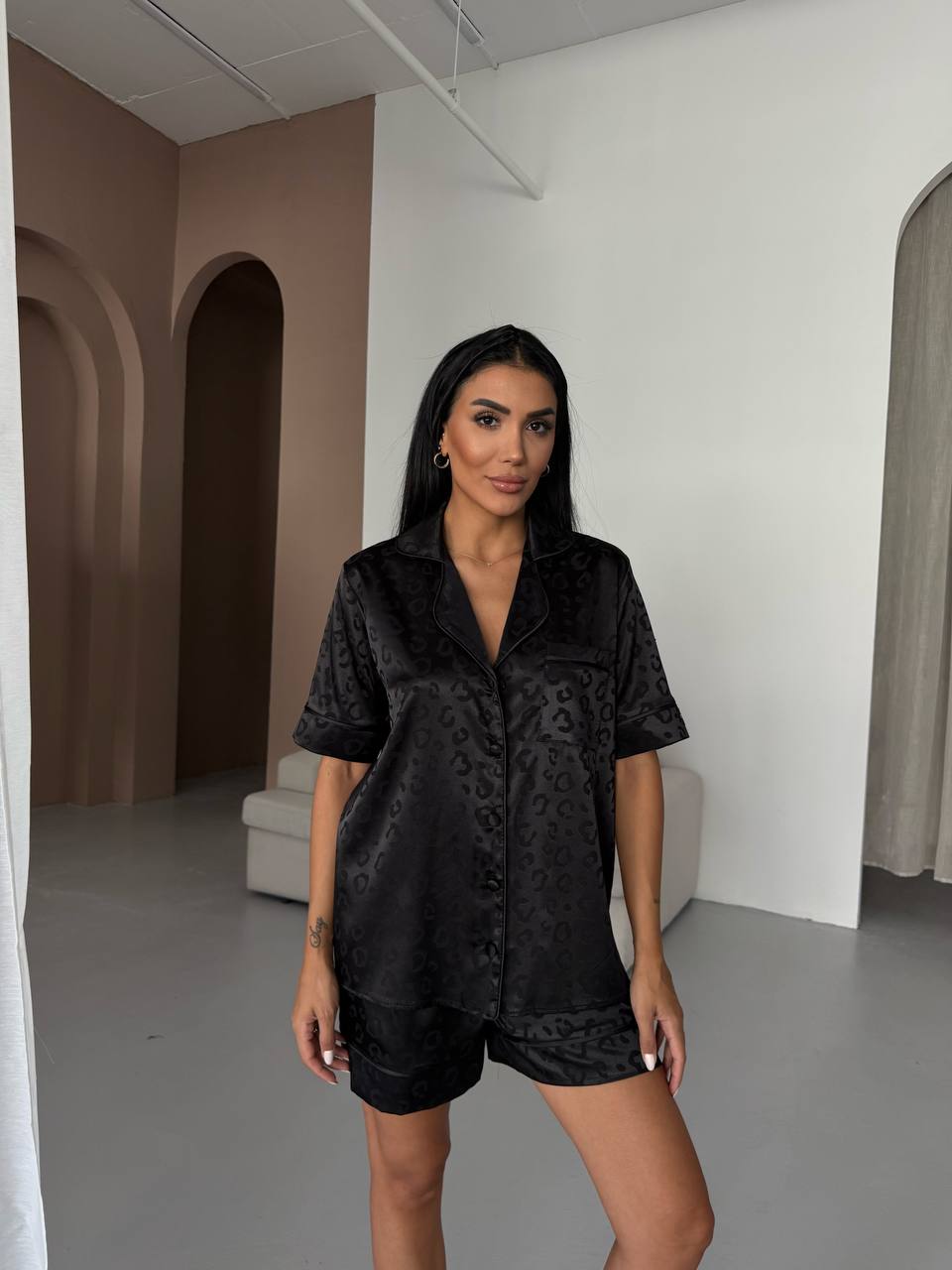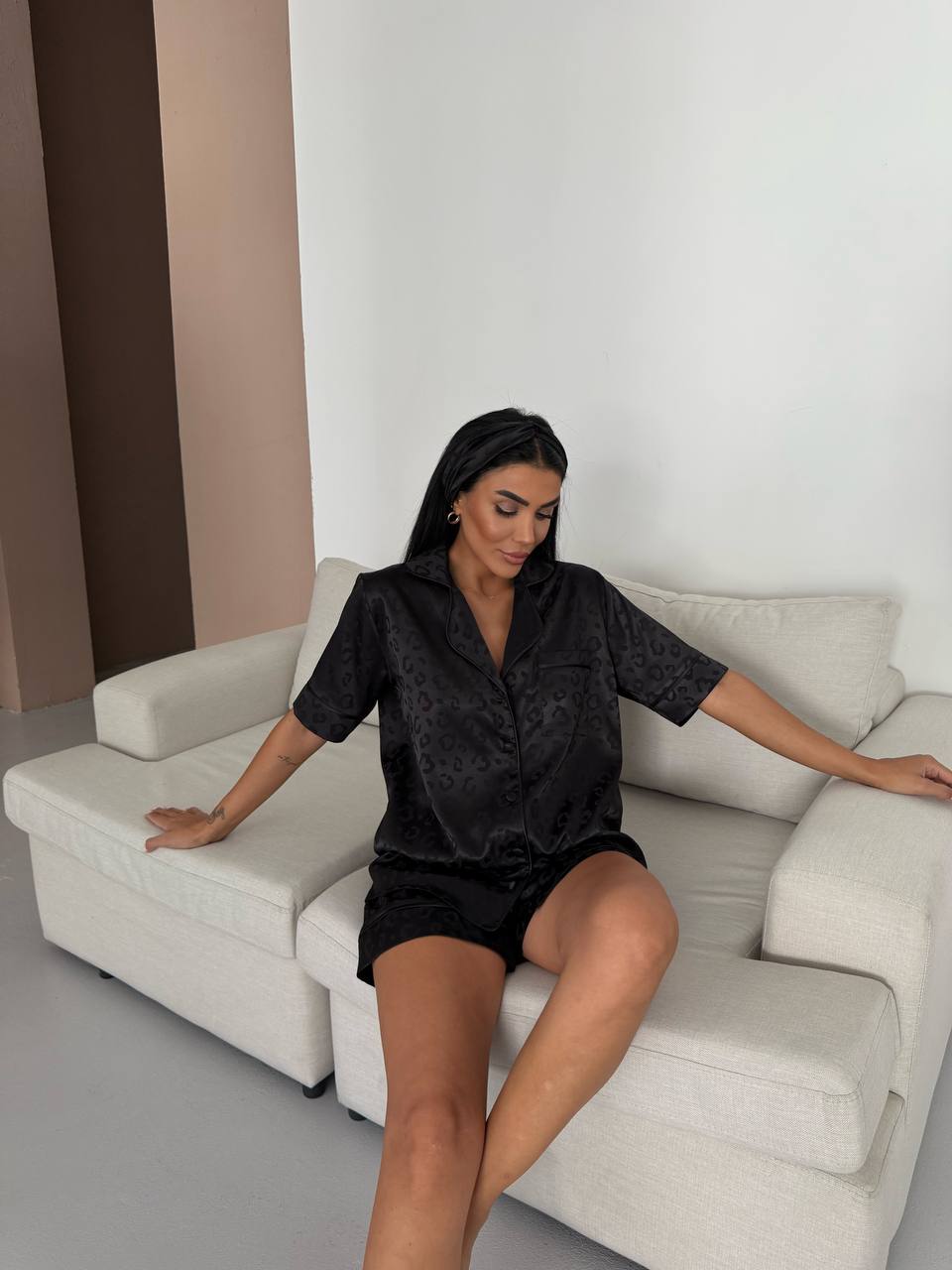 Горнището е с къс ръкав, копчета по цялата дължина и джобче отпред – идеално съчетание между удобство и елегантност. Долнището е удобни къси шорти с еластичен колан.