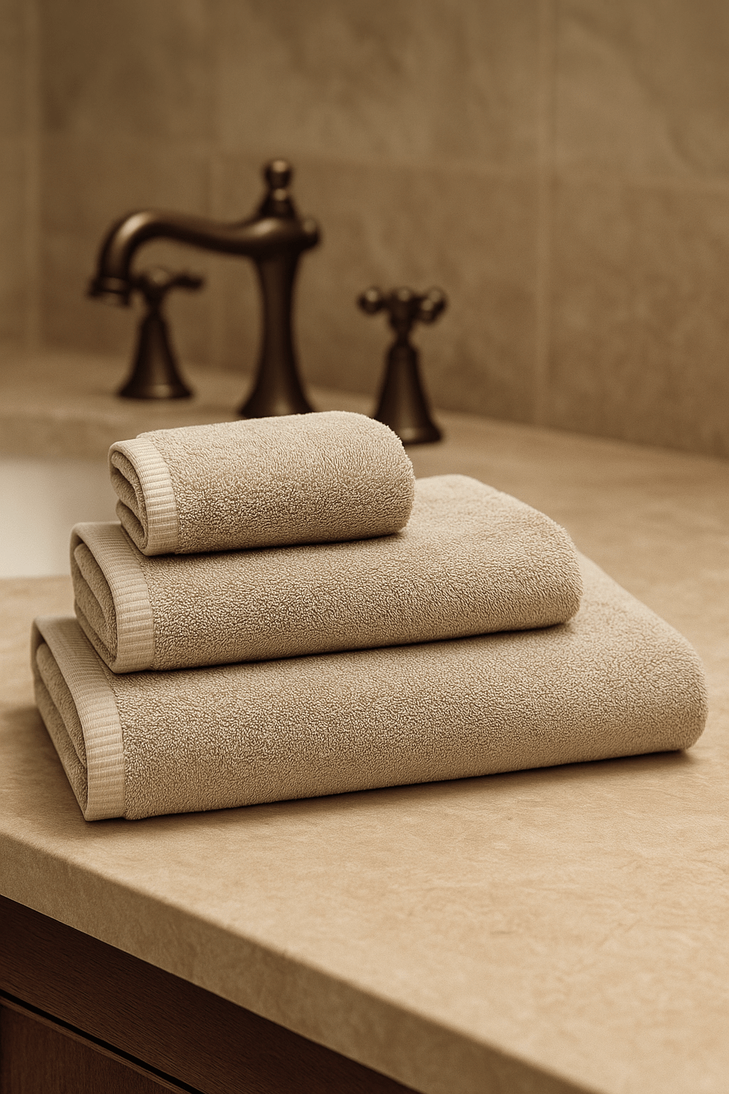 Комплект хавлии от 100% памук в бежов цвят – меки и абсорбиращи.