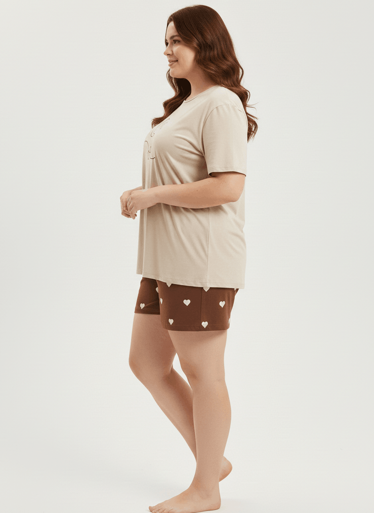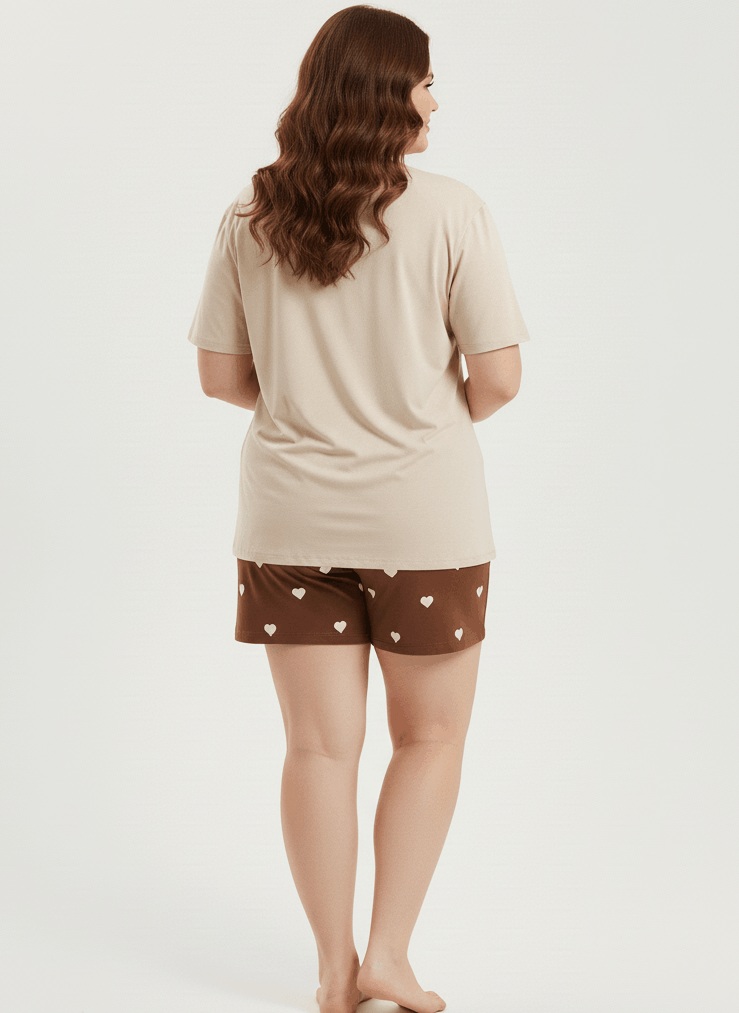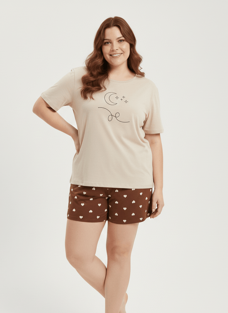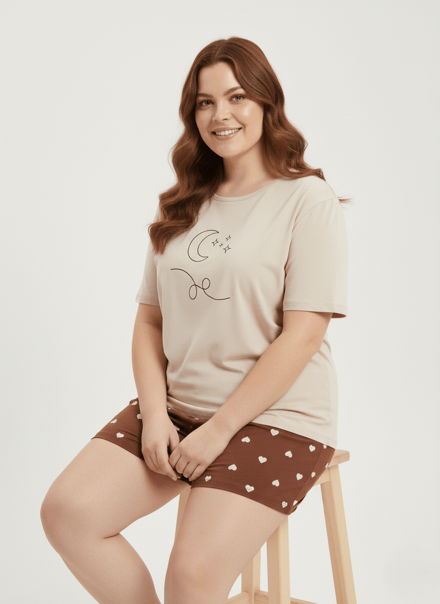 Открий комфорта и стила с тази дамска макси пижама, създадена специално за жени, които ценят удобството без компромис с визията. Комплектът включва свободна тениска с ефектен принт и kъси панталони. Свободната кройка е подходяща за макси дами, като подчертава силуета по елегантен и ненатрапчив начин. Ластичната талия на панталона гарантира перфектно прилягане и удобство при носене.