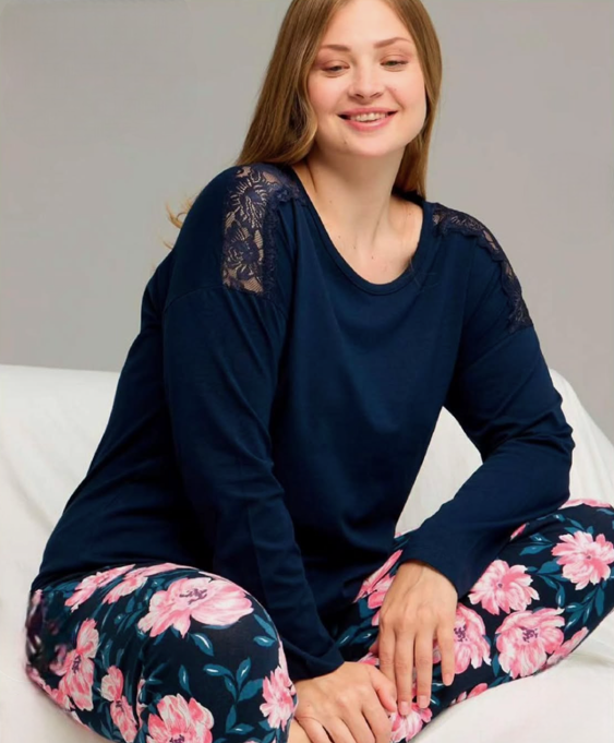 👚  Макси дамска пижама изработена от висококачествен, мек и дишащ памук, който осигурява комфорт и свобода на движение през цялата нощ. Горнището е с дълъг ръкав и дантела в горната част на ръкавите, а долнището е дълъг панталон с еластична талия за удобно прилягане (без маншет). Идеална за дами, които търсят удобство и стил в големи размери.
