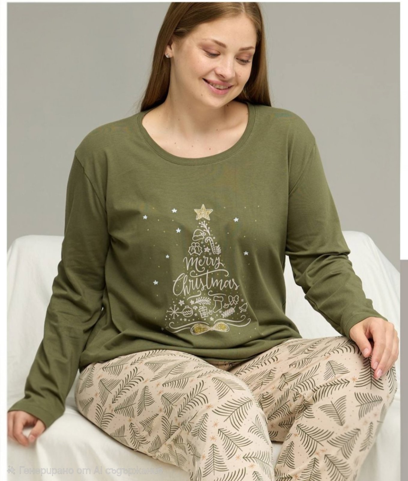 👚 Макси дамска пижама в нежен бежов цвят с изчистен дизайн и стилен принт на листа. Изработена от висококачествен, мек и дишащ памук, който осигурява комфорт и свобода на движение през цялата нощ. Горнището е с дълъг ръкав, декоративни копчета, а долнището – с еластична талия за удобно прилягане. Идеална за дами, които търсят удобство и стил в големи размери.