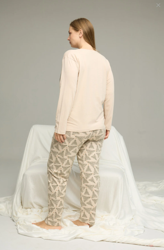 👚 Макси дамска пижама в нежен бежов цвят с изчистен дизайн и стилен принт на листа. Изработена от висококачествен, мек и дишащ памук, който осигурява комфорт и свобода на движение през цялата нощ. Горнището е с дълъг ръкав, декоративни копчета, а долнището – с еластична талия за удобно прилягане. Идеална за дами, които търсят удобство и стил в големи размери.