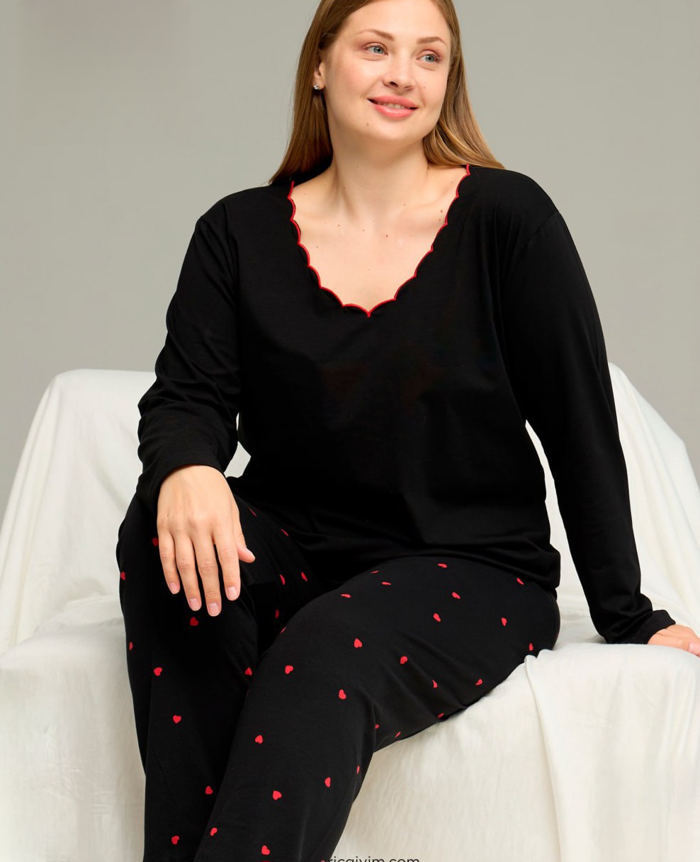 Създадена за комфорт и самочувствие, тази дамска пижама плюс размер е изработена от висококачествена материя – 95% памук и 5% ликра. Меката и дишаща тъкан осигурява свобода на движение и удобство, а еластичността подчертава женствените форми, без да стяга.
