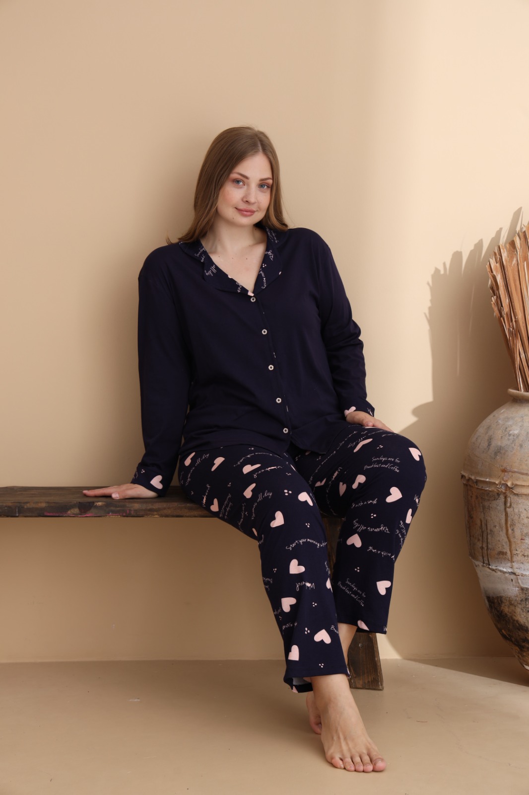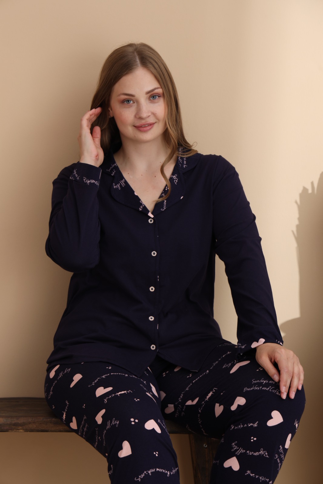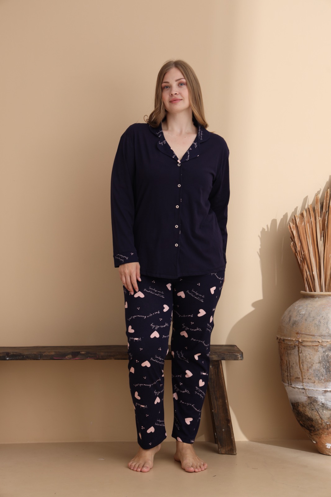 Създадена за комфорт и самочувствие, тази дамска пижама плюс размер е изработена от висококачествена материя. Меката и дишаща тъкан осигурява свобода на движение и удобство, а еластичността подчертава женствените форми, без да стяга.