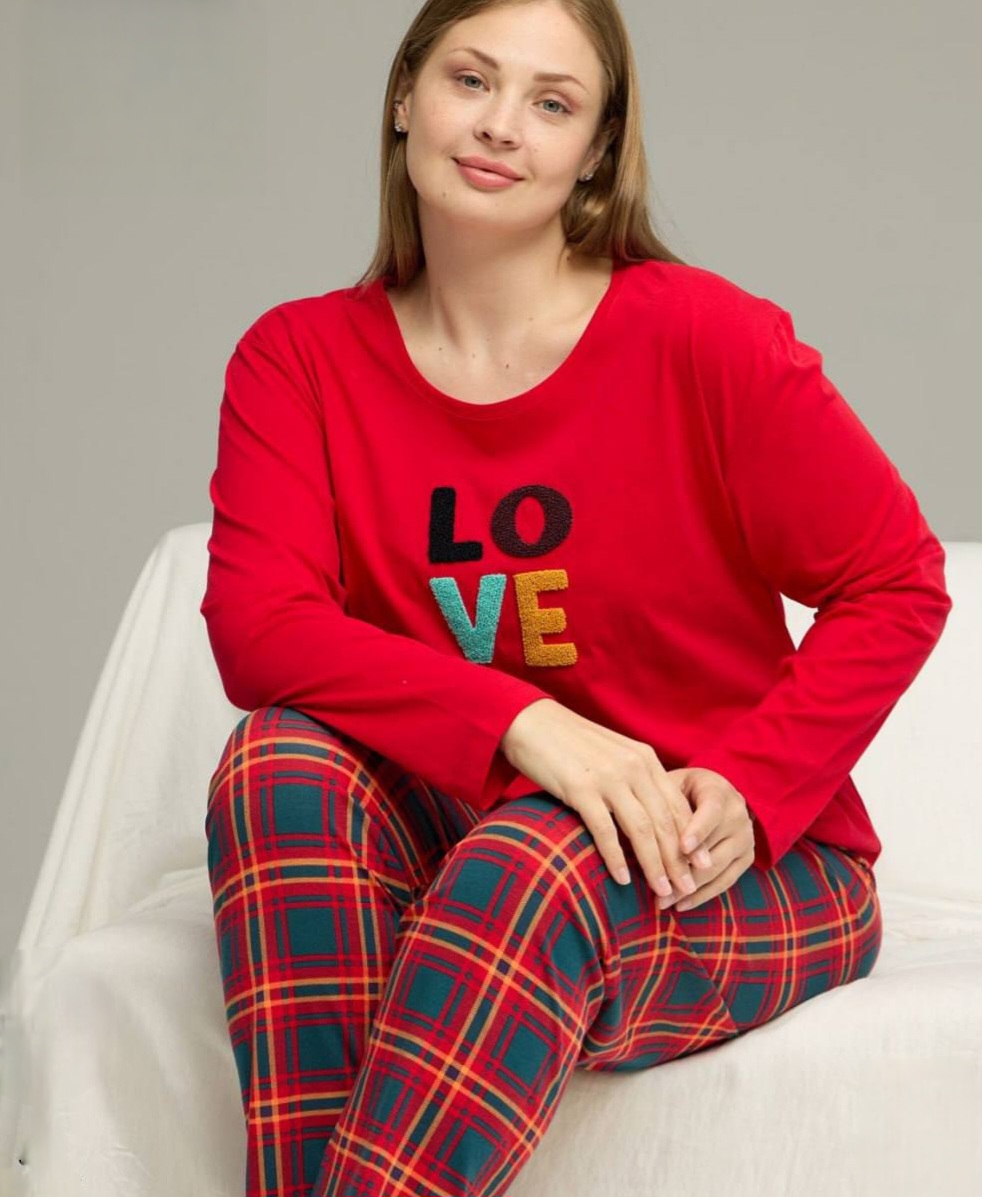 Създадена за комфорт и самочувствие, тази дамска пижама плюс размер е изработена от висококачествена материя – 95% памук и 5% ликра. Меката и дишаща тъкан осигурява свобода на движение и удобство, а еластичността подчертава женствените форми, без да стяга.