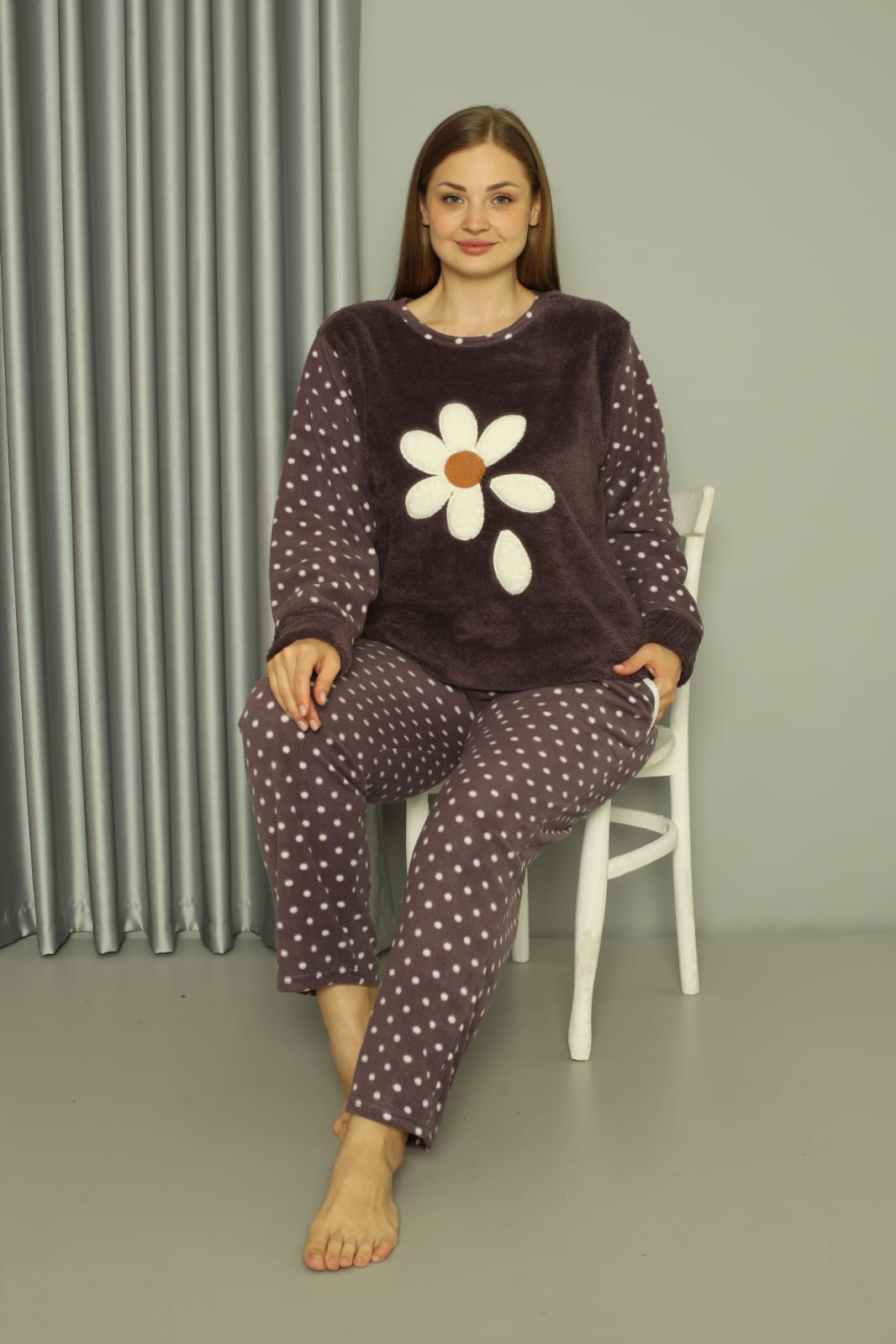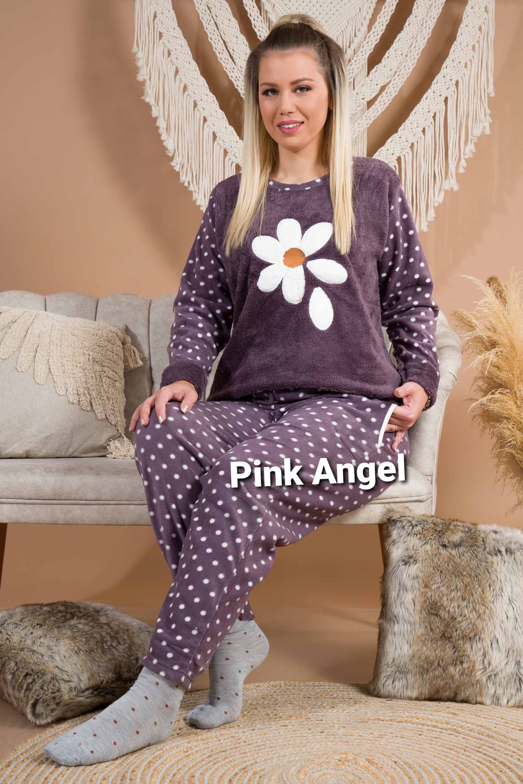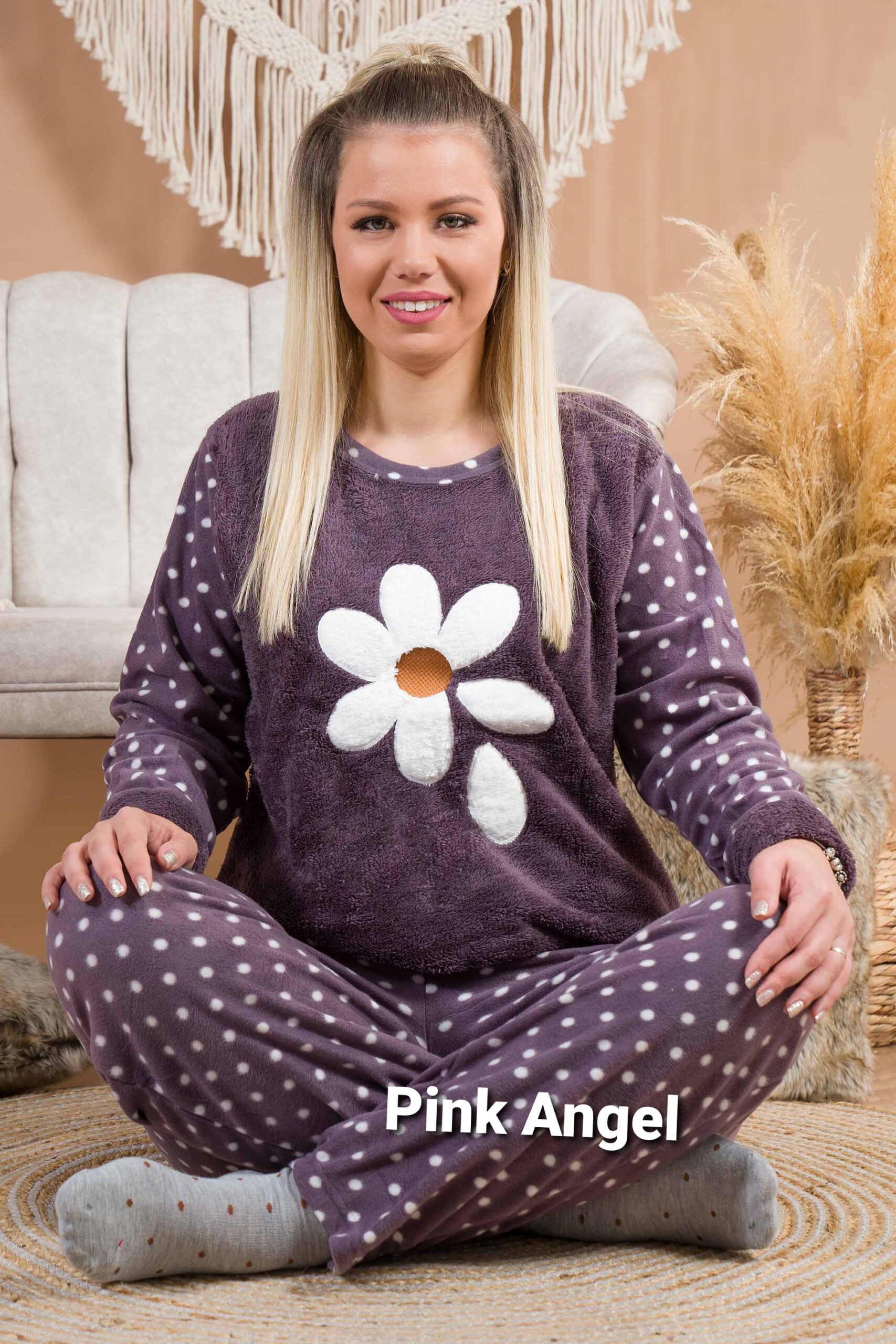 Топла дамска пижама в две част. Изработена от полар и велсофт. С апликация – маргаритка. Долнището е с джобове и без маншет.