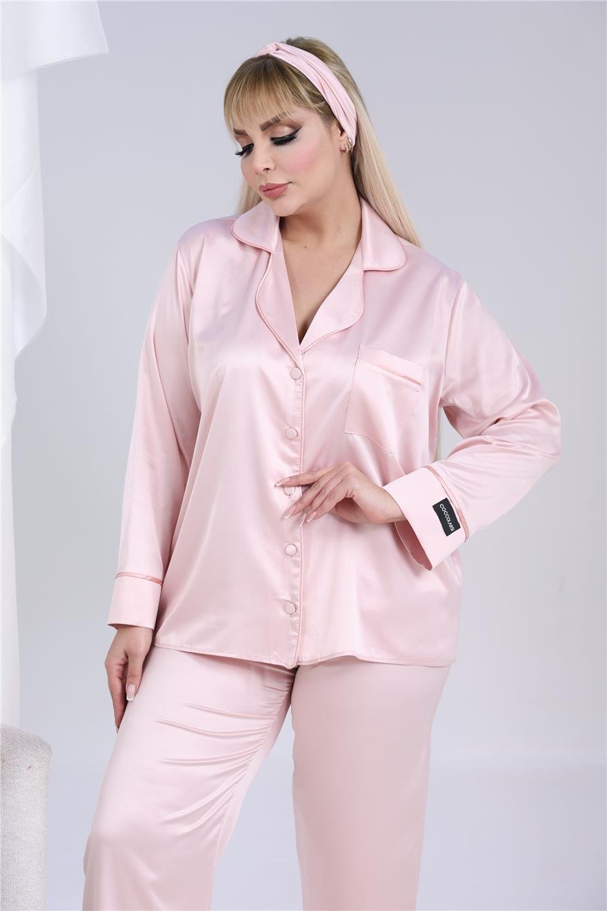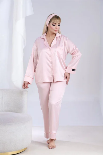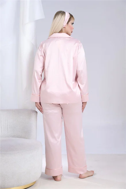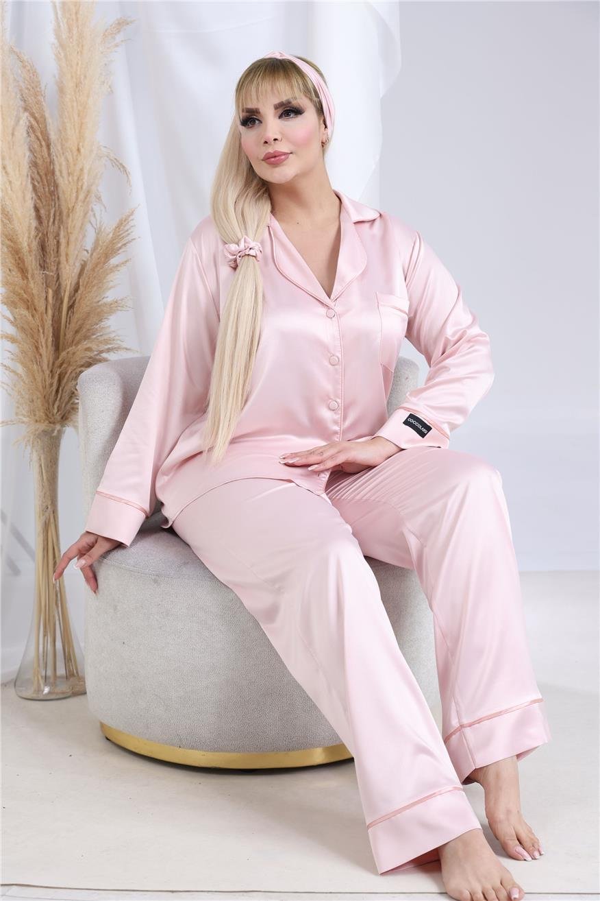 Луксозна макси сатенена пижама с подарък-скрънчи и лента за коса. Изработена от мек и гладък сатен. Горнището е с дълъг ръкав, копчета по цялата дължина и джобче отпред. Долнището е дълъг панталон с еластичен колан.