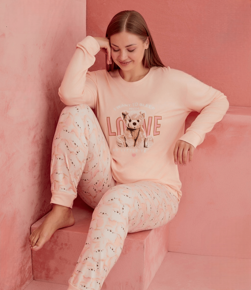 Топла термална пижама – идеален избор за студените зимни вечери. Изработена от фино плетена материя, която задържа топлината и осигурява максимален комфорт по време на сън или почивка у дома. Горнището е с дълъг ръкав и апликация с надпис, а долнището е с раиран десен и маншети. Пижамата е мека, удобна и дишаща, което я прави подходяща както за нощен сън, така и за уютни моменти у дома.