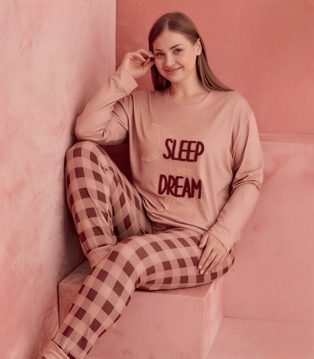 Топла термална пижама – идеален избор за студените зимни вечери. Изработена от фино плетена материя, която задържа топлината и осигурява максимален комфорт по време на сън или почивка у дома. Горнището е с дълъг ръкав и апликация с надпис, а долнището е с раиран десен и маншети. Пижамата е мека, удобна и дишаща, което я прави подходяща както за нощен сън, така и за уютни моменти у дома.