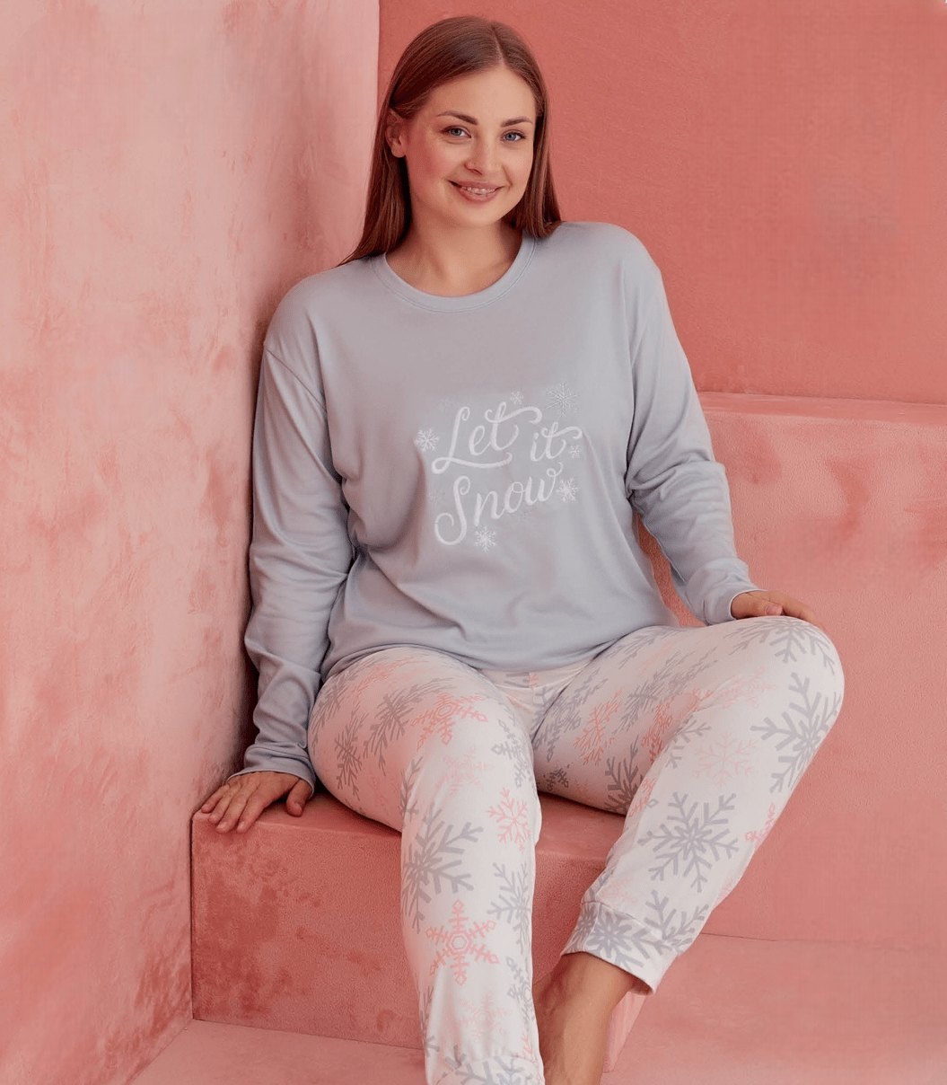 Топла термална пижама  – идеален избор за студените зимни вечери. Изработена от фино плетена материя, която задържа топлината и осигурява максимален комфорт по време на сън или почивка у дома. Горнището е с дълъг ръкав и апликация с надпис “Let it Snow”, а долнището е с маншет и елегантен снежно-зимен десен. Пижамата е мека, удобна и дишаща, което я прави подходяща както за нощен сън, така и за уютни моменти у дома.