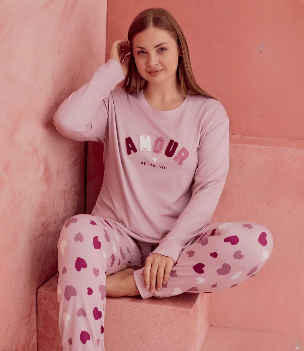 Топла термална пижама – идеален избор за студените зимни вечери. Изработена от фино плетена материя, която задържа топлината и осигурява максимален комфорт по време на сън или почивка у дома. Горнището е с дълъг ръкав и апликация с надпис, а долнището е с раиран десен и маншети. Пижамата е мека, удобна и дишаща, което я прави подходяща както за нощен сън, така и за уютни моменти у дома.