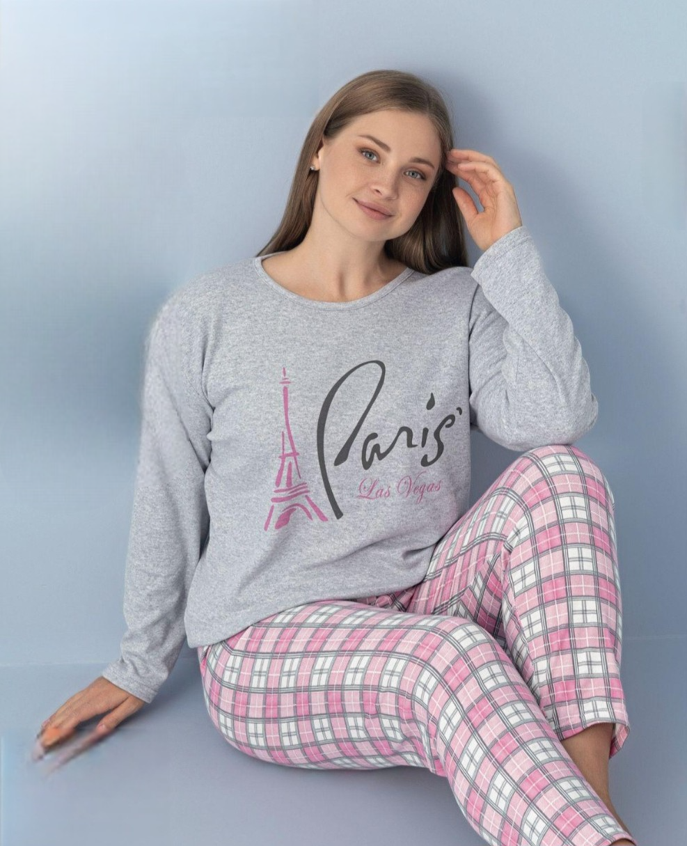 Подарете си топлина и комфорт с тази очарователна дамска пижама, изработена от плътна и мека памучна материя (интерлог), идеална за зимния сезон. Горнището е с дълъг ръкав и щампа. Долнището е дълъг панталон без маншет.