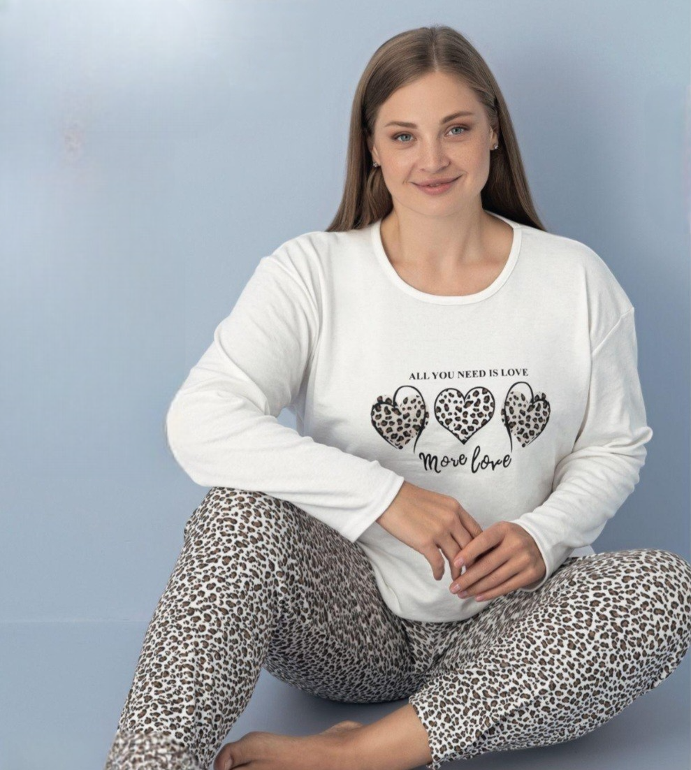 Подарете си топлина и комфорт с тази очарователна дамска пижама, изработена от плътна и мека памучна материя (интерлог), идеална за зимния сезон. Горнището е с дълъг ръкав и щампа. Долнището е дълъг панталон без маншет.