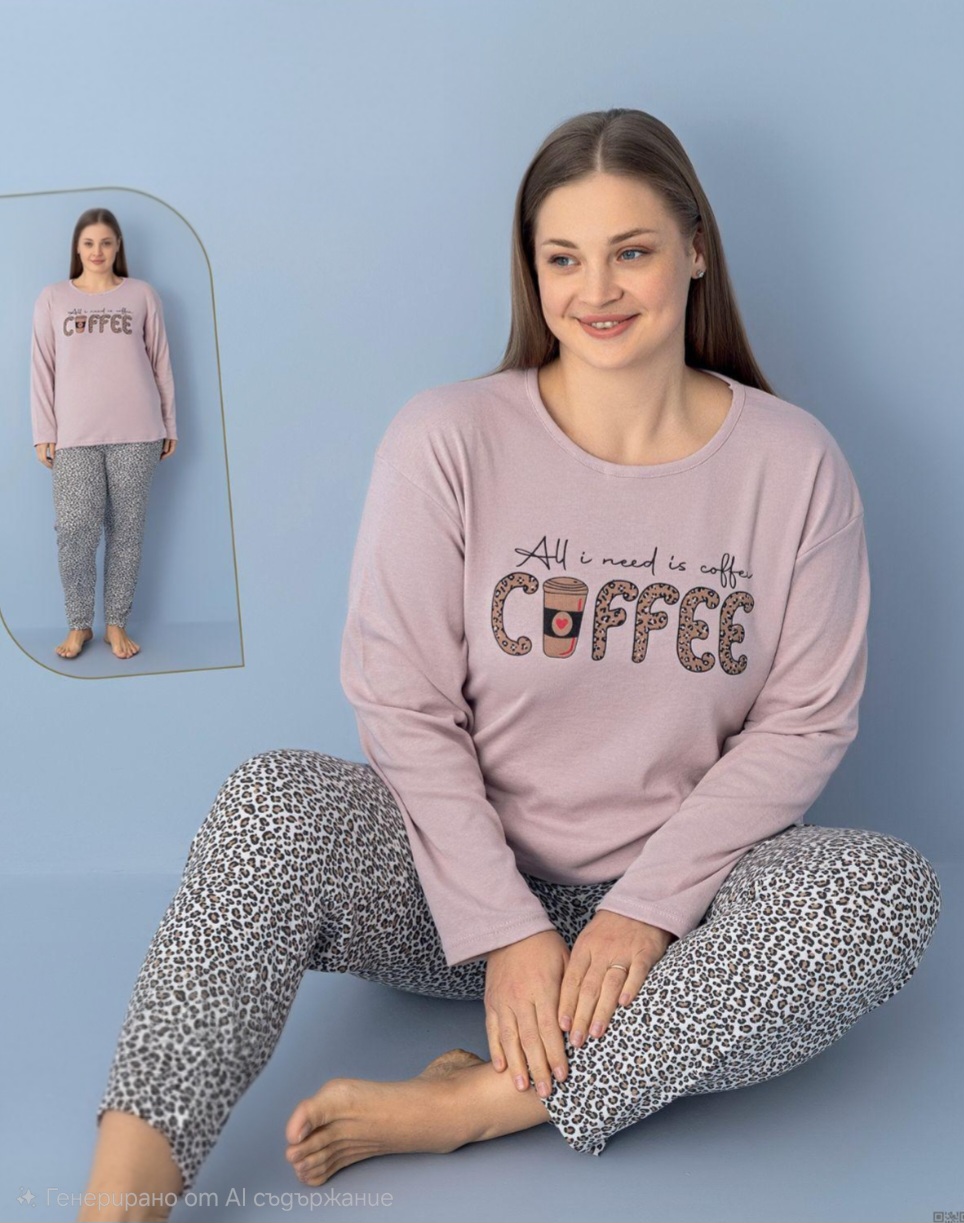 Подарете си топлина и комфорт с тази очарователна дамска пижама, изработена от плътна и мека памучна материя (интерлог), идеална за зимния сезон. Горнището е с дълъг ръкав и щампа. Долнището е дълъг панталон без маншет.