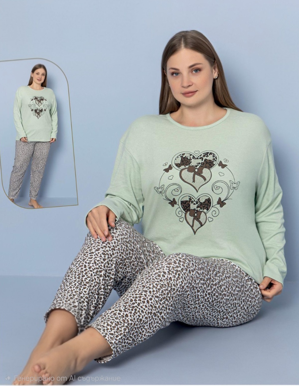 Подарете си топлина и комфорт с тази очарователна дамска пижама, изработена от плътна и мека памучна материя (интерлог), идеална за зимния сезон. Горнището е с дълъг ръкав и щампа. Долнището е дълъг панталон без маншет.
