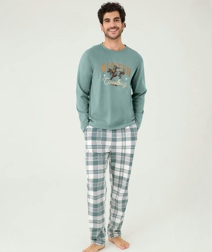 Открий истинския домашен комфорт с тази мъжка памучна пижама. Изработена от мека и дишаща материя, тя осигурява комфорт през цялата нощ и свобода на движенията. Горната част е с модерна щампа и изчистен дизайн, а долната част е с кариран десен (без маншети).