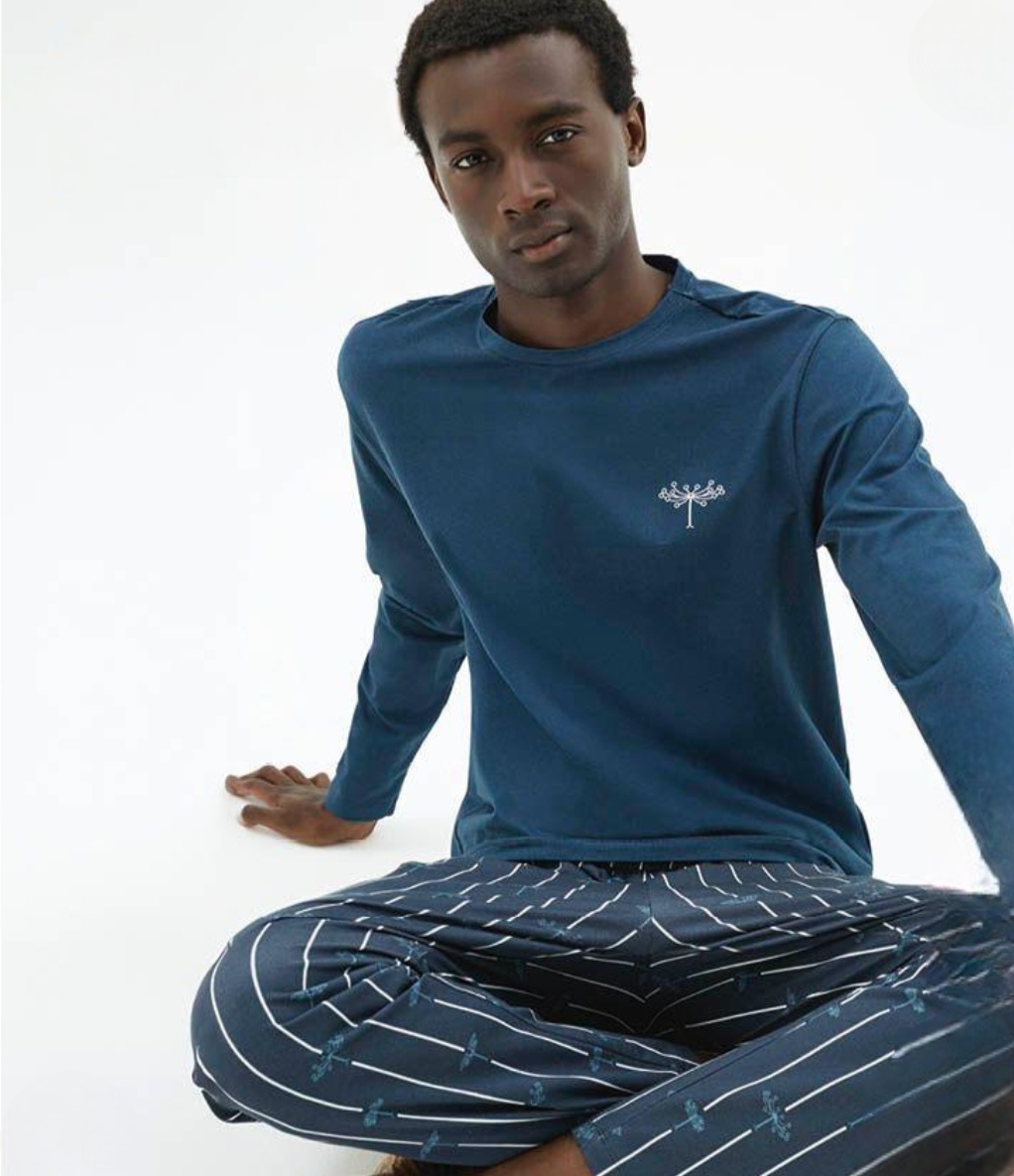Открий истинския домашен комфорт с тази мъжка памучна пижама. Изработена от мека и дишаща материя, тя осигурява комфорт през цялата нощ и свобода на движенията. Горната част е с модерна малка щампа и изчистен дизайн, а долната част е с интересен десен (без маншети).