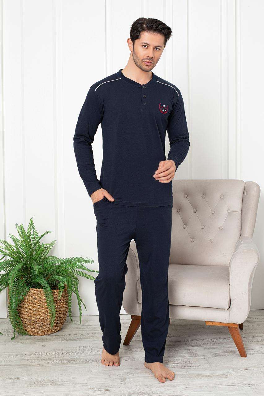 Памучна пижама от две части. Горнището е с дълъг ръкав, обло деколте, три копчета и бродерия. Долнището е с дълъг крачол .