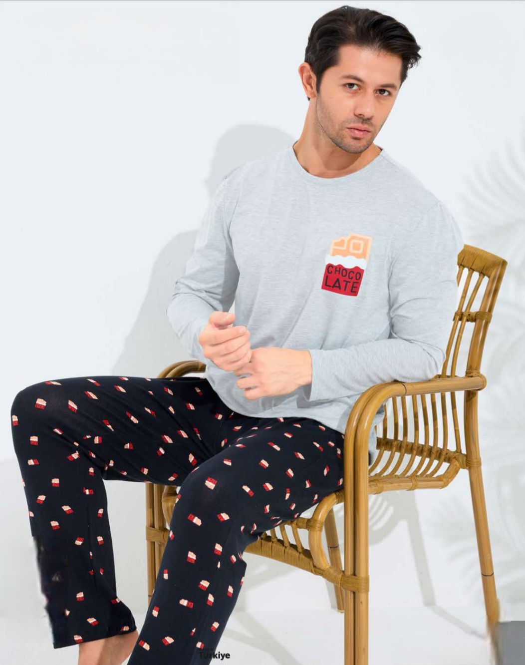 Памучна пижама от две части. Горнището е с дълъг ръкав, обло деколте и щампа. Долнището е с дълъг крачол и е без маншет .
