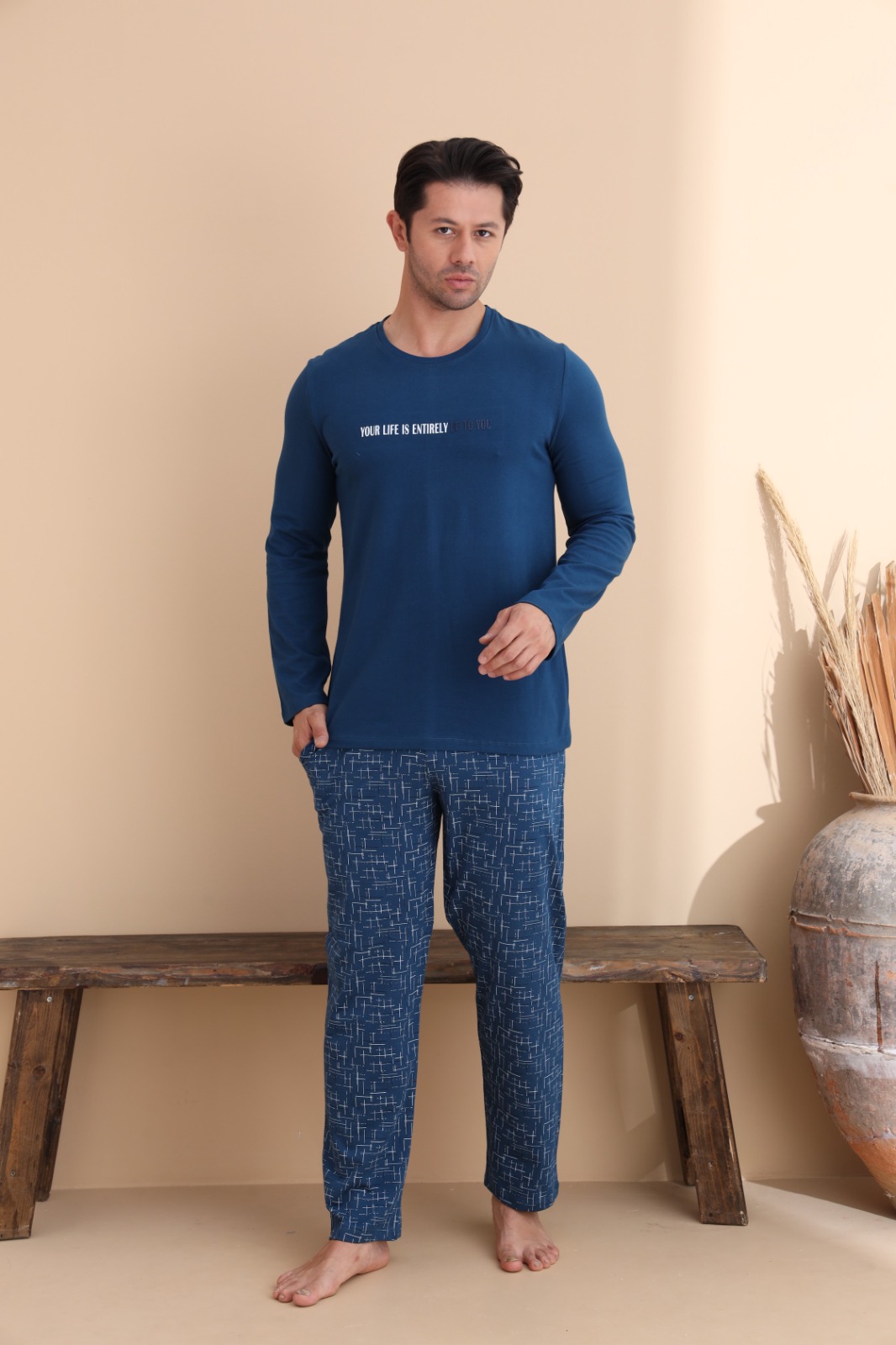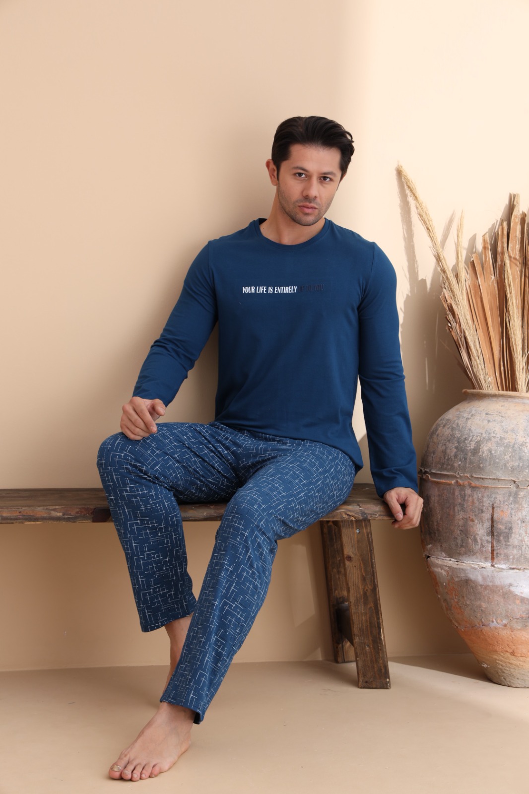 Мъжка пижама с дълъг ръкав – удобство и стил за спокойни нощи. Горната част е с модерна щампа и изчистен дизайн, а долната част е с интересен геометричен десен. Изработена от мека и дишаща материя, тази пижама осигурява комфорт през цялата нощ и свобода на движенията. Подходяща е както за сън, така и за релакс у дома.