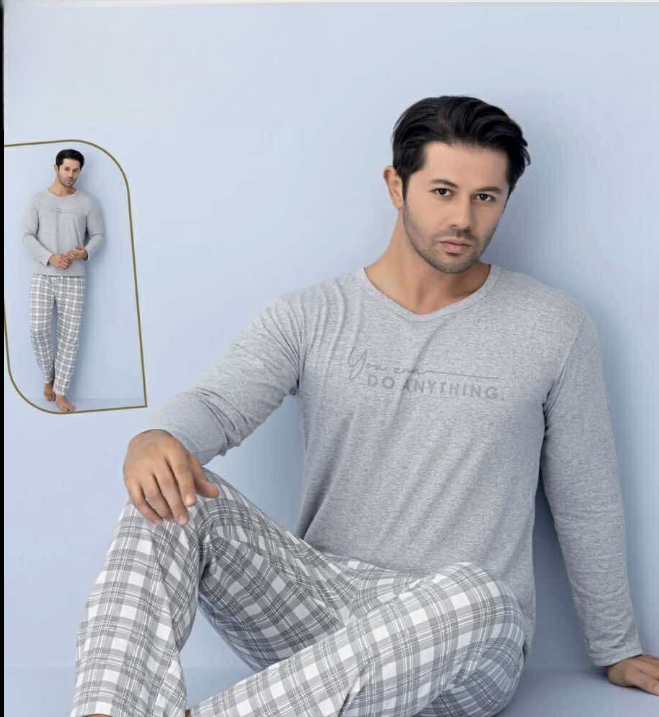 Памучна пижама от две части. Горнището е с дълъг ръкав и обло деколте. Долнището е с дълъг крачол .