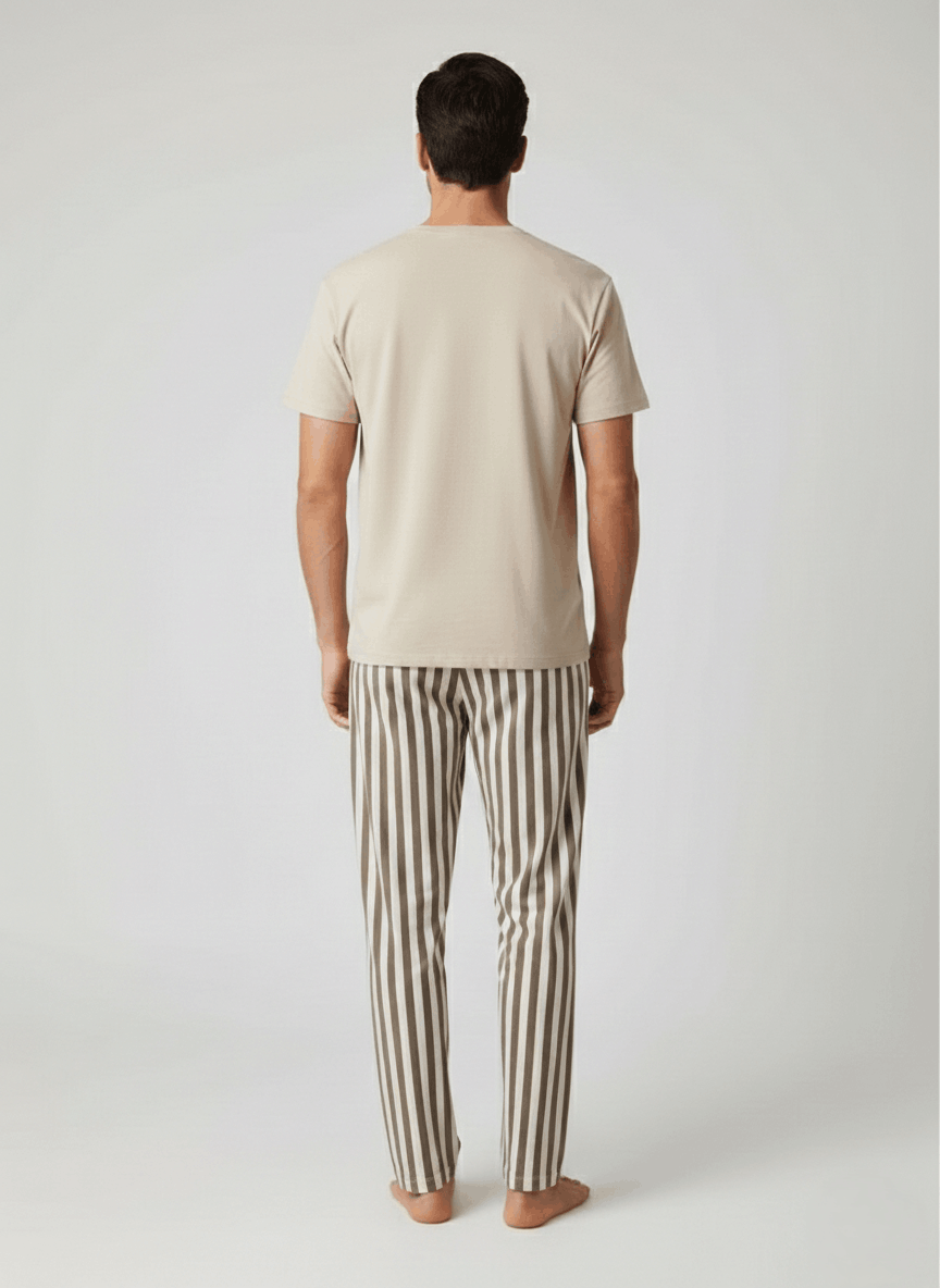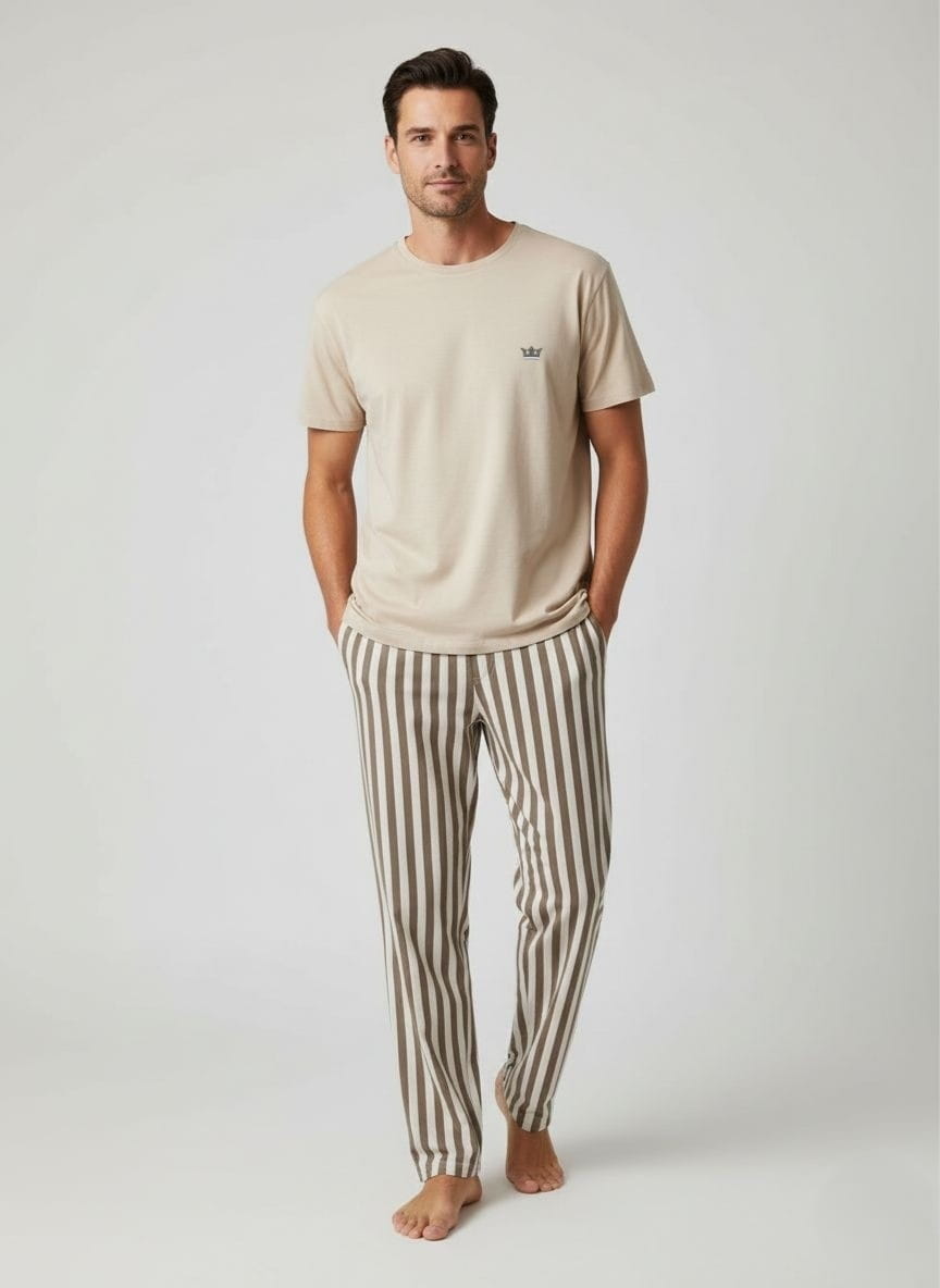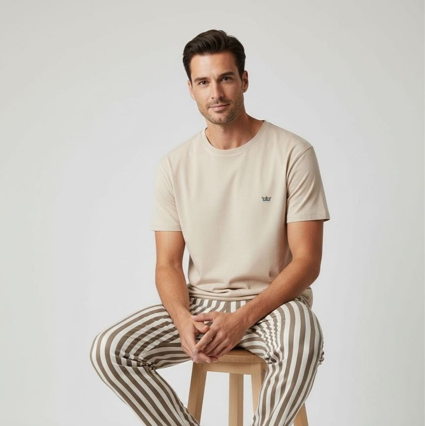 Мъжка пижама. Комплектът включва тениска с къс ръкав и обло деколте, изработена от мека и дишаща материя, която осигурява удобство през цялата нощ. Долнището е с кариран дизайн с еластична талия без маншети. Подходяща за сън и домашен комфорт през пролетно-летния сезон. Идеален избор за мъже, които търсят удобна, модерна и качествена мъжка пижама.