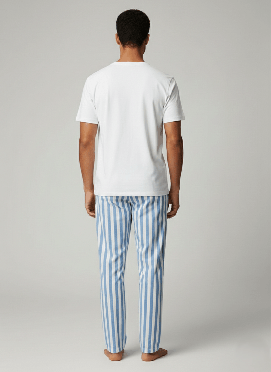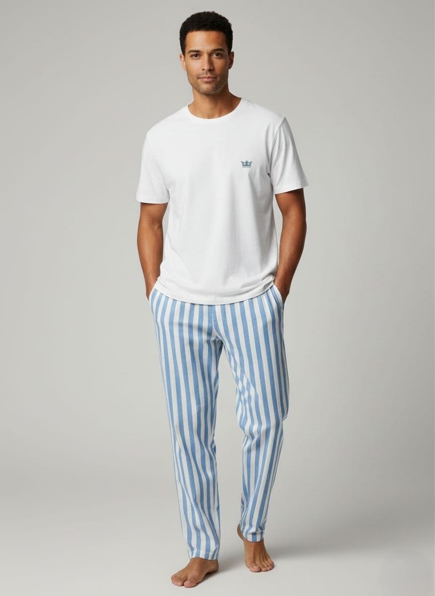 Мъжка пижама. Комплектът включва тениска с къс ръкав и обло деколте, изработена от мека и дишаща материя, която осигурява удобство през цялата нощ. Долнището е с кариран дизайн с еластична талия без маншети. Подходяща за сън и домашен комфорт през пролетно-летния сезон. Идеален избор за мъже, които търсят удобна, модерна и качествена мъжка пижама.