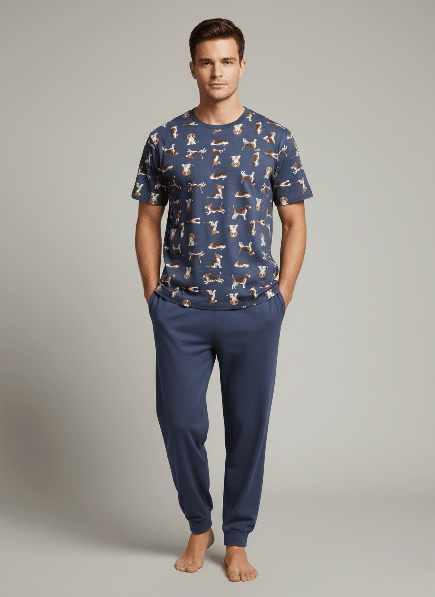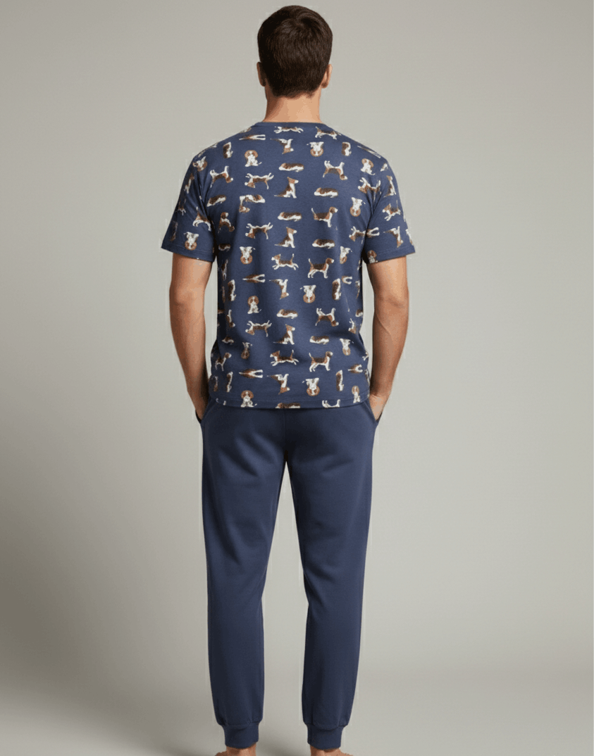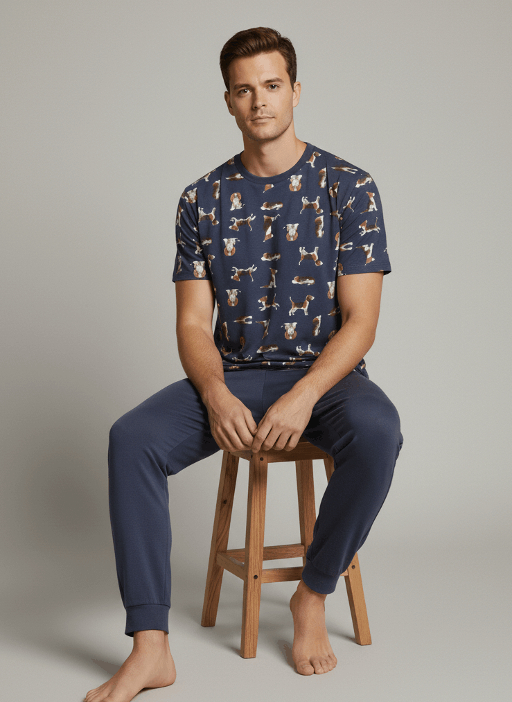 Мъжка пижама с модерен принт на кучета – перфектната комбинация от комфорт и свеж дизайн. Комплектът включва тениска с къс ръкав и обло деколте, изработена от мека и дишаща материя, която осигурява удобство през цялата нощ. Долнището е в изчистен дизайн с еластична талия и маншети за оптимално прилягане и свобода на движение. Подходяща за сън и домашен комфорт през пролетно-летния сезон. Идеален избор за мъже, които търсят удобна, модерна и качествена мъжка пижама с оригинален десен.