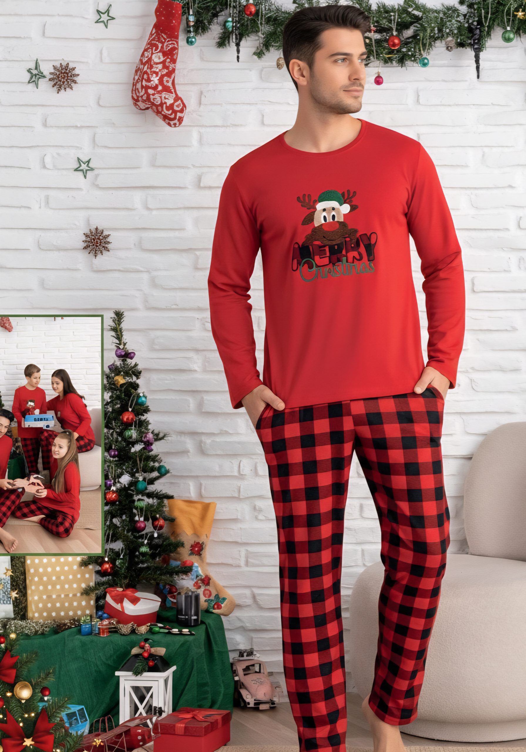 Внесете празнично настроение и стил у дома с този коледен комплект пижама. Горната част е в класическо черно с весел коледен елен и надпис „Merry Christmas“, което придава модерен и забавен вид. Долнището е в червено-черно каре – един от най-предпочитаните зимни мотиви, съчетаващ уют и празнична естетика. Меката и удобна материя осигурява топлина и комфорт през студените дни, което прави комплекта идеален за почивка, коледни събирания или семейни фотосесии.