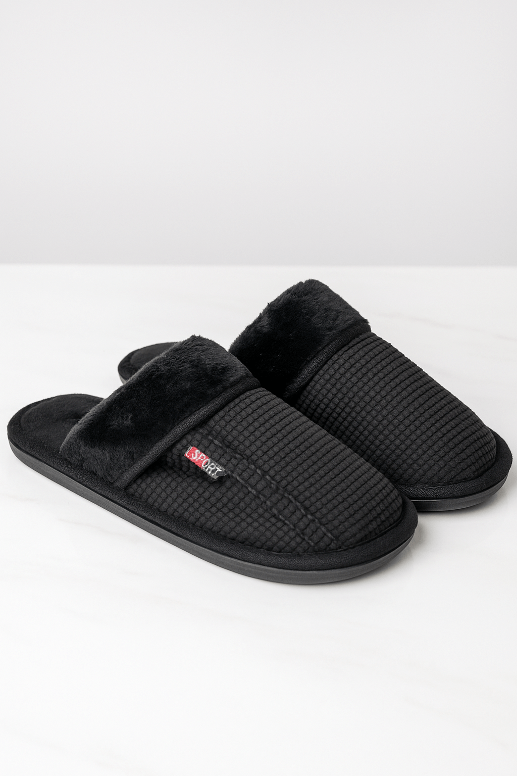 Топли и удобни мъжки домашни пантофи в черен цвят с мека вътрешна подплата и устойчива подметка – идеални за комфорт у дома през студените месеци.