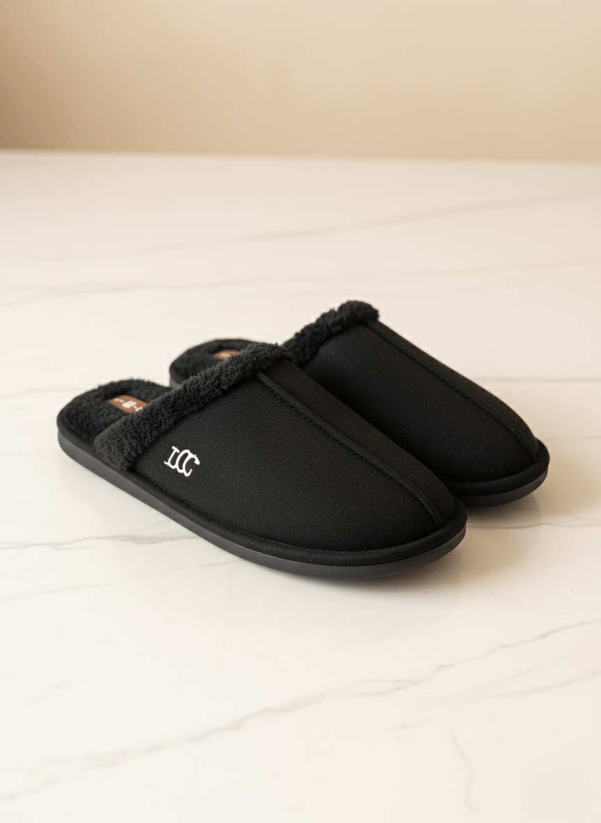 Топли и удобни мъжки домашни пантофи в черен цвят с мека вътрешна подплата и устойчива подметка – идеални за комфорт у дома през студените месеци.