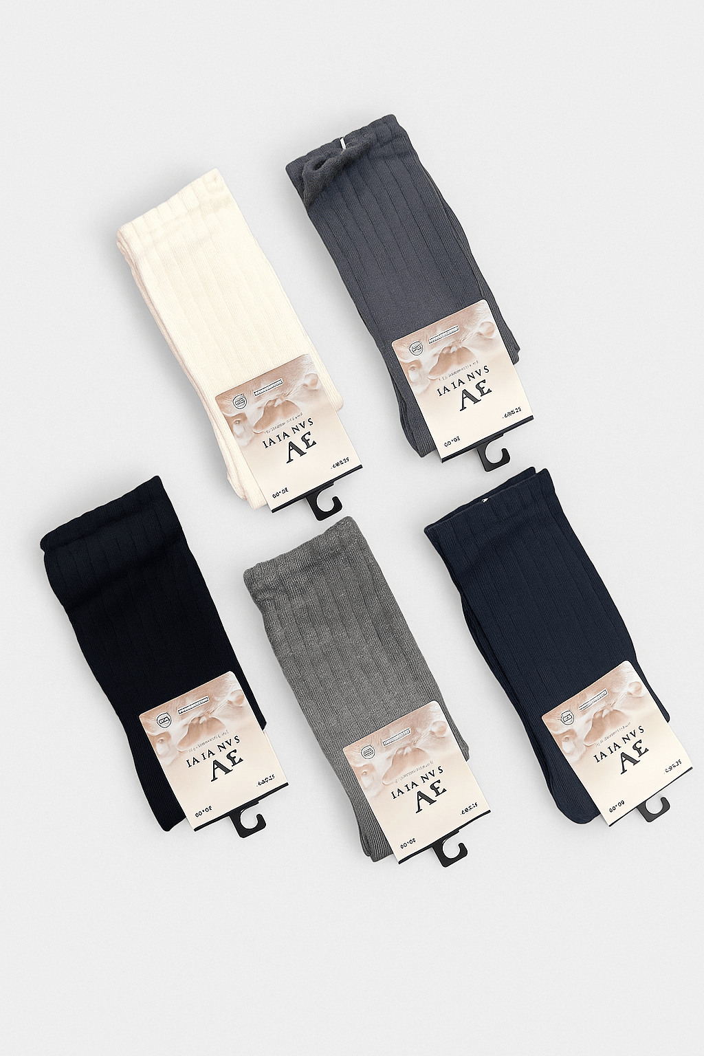 Потопи се в усещането за лукс с нашия комплект от 5 чифта мъжки кашмирени чорапи. Изработени от висококачествена смес с кашмир, те осигуряват изключителна мекота, топлина и дишане през целия ден. Подходящи са както за ежедневието, така и за студените зимни дни.