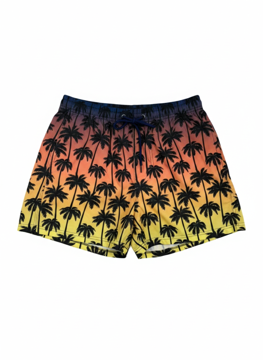 Мъжки бански шорти с модерен тропически дизайн. Моделът е декориран с ефектен принт на палми, който създава усещане за лятна ваканция, море и екзотика. Изработен от лека и бързосъхнеща материя, банският осигурява комфорт както на плажа, така и край басейна. Моделът е с удобна еластична талия и регулируема връзка за перфектно прилягане. С вътрешен мрежест бандаж. Моделът е с два странични джоба.