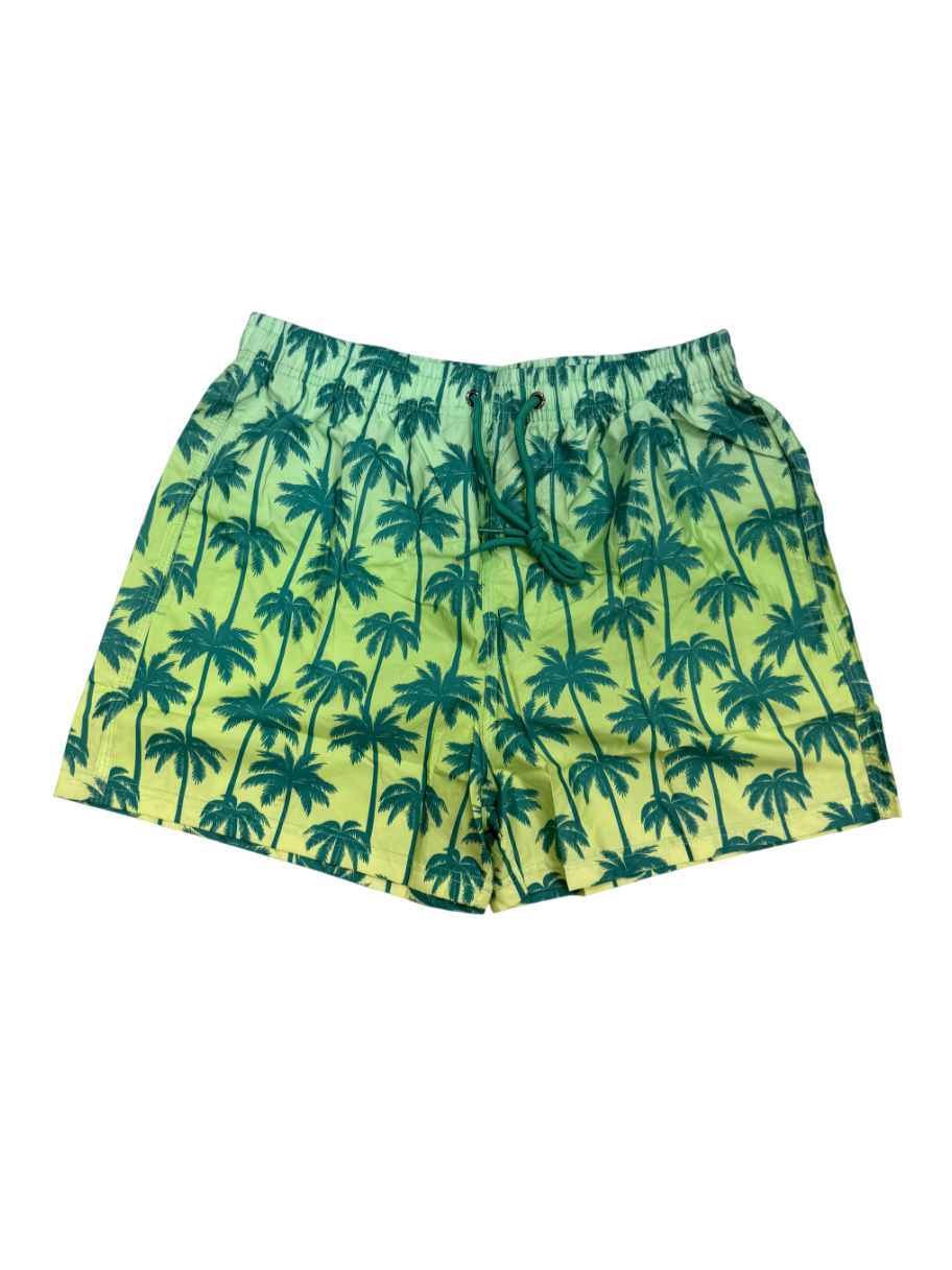 Мъжки бански шорти с модерен тропически дизайн. Моделът е декориран с ефектен принт на палми, който създава усещане за лятна ваканция, море и екзотика. Изработен от лека и бързосъхнеща материя, банският осигурява комфорт както на плажа, така и край басейна. Моделът е с удобна еластична талия и регулируема връзка за перфектно прилягане. С вътрешен мрежест бандаж. Моделът е с два странични джоба.